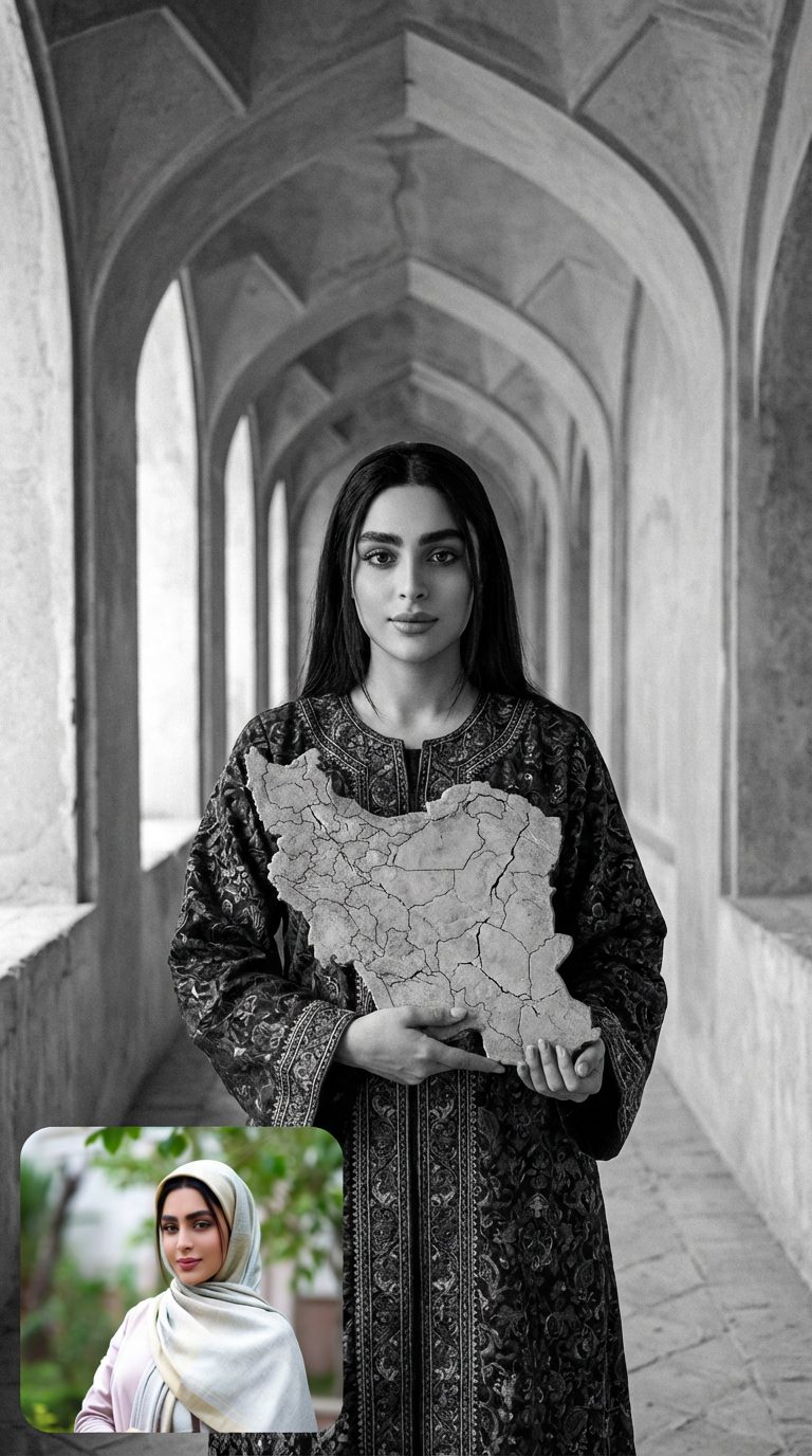 Ultra-realistic black and white cinematic portrait of a Iranian [reference image gender] standing in a traditional Persian architectural corridor, identical to the reference image.