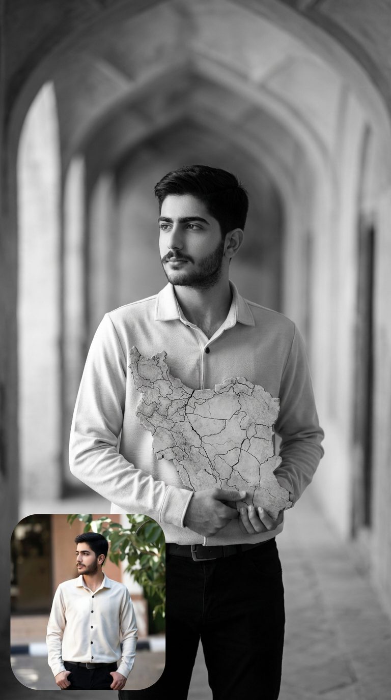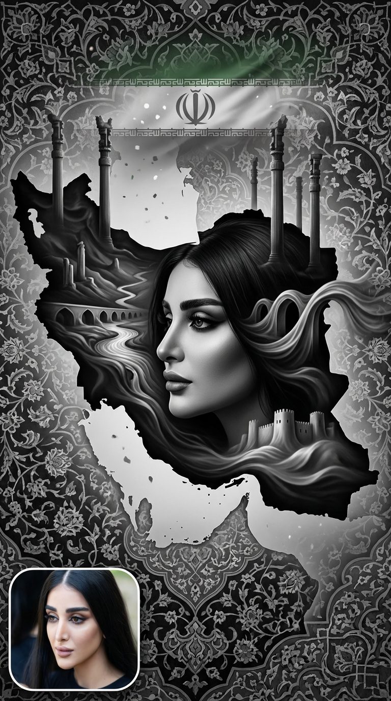 دانلودCreate a highly artistic and imaginative image featuring the map of Iran as the central focal، point, rendered in a striking black and white (monochrome) style to emphasize historical and cultural depth. Place the reference face in profile view (side profile) at the exact center of the Iran map, seamlessly integrated with the map’s contours, symbolizing national identity and unity.Surround the map with symbolic Iranian elements in a surreal and abstract manner: towering columns of Persepolis emerging ethereally from the borders like shadows, the arches of Si-o-Se Pol flowing like waves along the Zayandeh Rud river, the ancient walls of Arg-e Bam reimagined as dreamy, silk-like fortifications, along with intricate Esfahan floral motifs (gol-o-bolbol), traditional Persian tilework patterns، and subtle floating particles evoking the Iranian flag.The overall composition should evoke a profound sense of patriotism and cultural pride, with balanced symmetry, dramatic lighting (deep shadows and high contrast for emotional depth), and an artistic style blending surrealism with digital graphic art—merging fantasy and reality. High resolution, intricate details, and a strong focus on Iran’s cultural aesthetics.Sample photo without changing the face, skin and hair color, and preserving the details of the face and body, without any changes, smoothing, reshaping, real skin texture on the face depending on the type of photo submitted, color and ambient light [Ultra-realistic, highly detailed 8K]