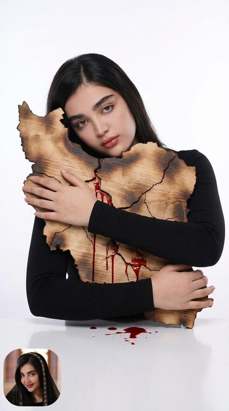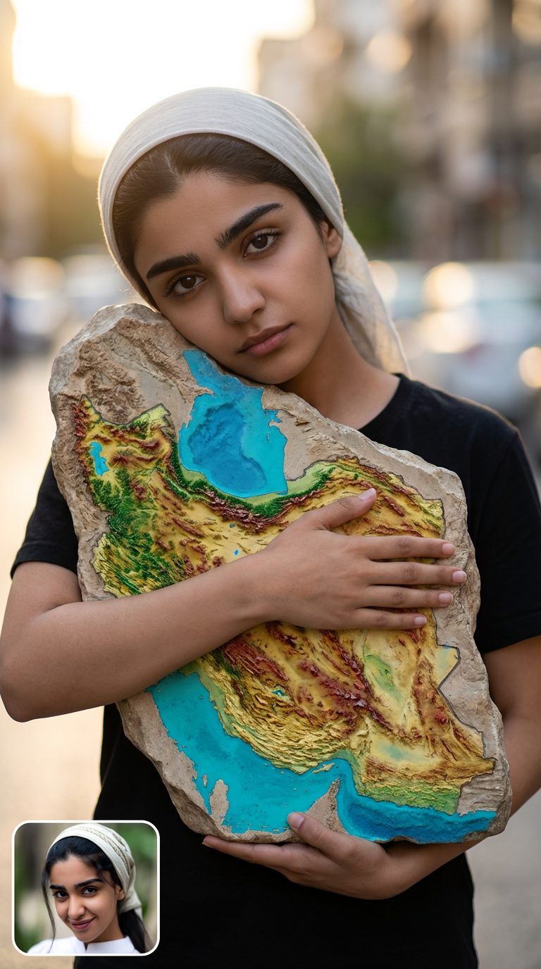 NON-NEGOTIABLE: 100% IDENTICAL WOMAN FACE, HAIR, TERMEH SHAWL, SERIOUS [removed]NO SMILE), HUGGING LARGE STONE TABLET CUT IN THE EXACT SHAPE OF IRAN MAP, RESTING HEAD ON IT – EXACTLY AS REQUESTED.