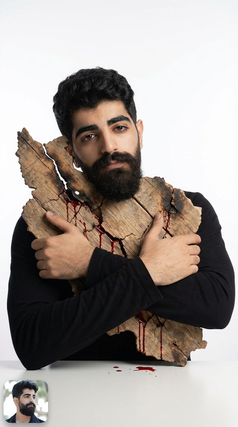 Ultra-high detail, realistic skin texture, realistic blood, realistic wood grain, professional studio photography, no artificial posing.