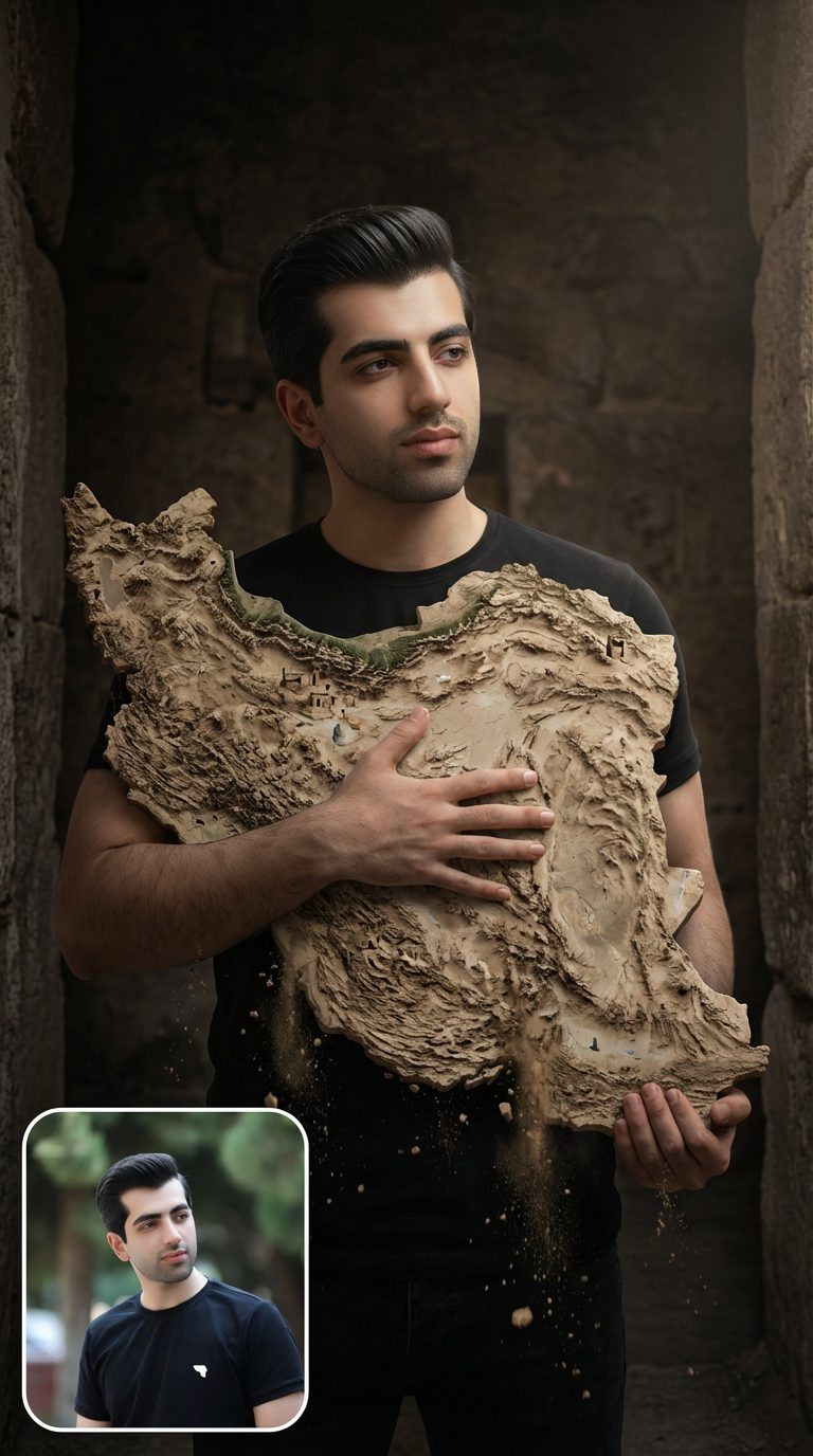برای دریافت خروجی مشابه تصاویر بالا که در آن چهره ی شما (یا سوژه) دقیقاً حفظ شود و المان ها (نقشه ایران سنگی/خاکی) با کیفیت بالا تولید شوند، مراحل زیر را طی کنید: