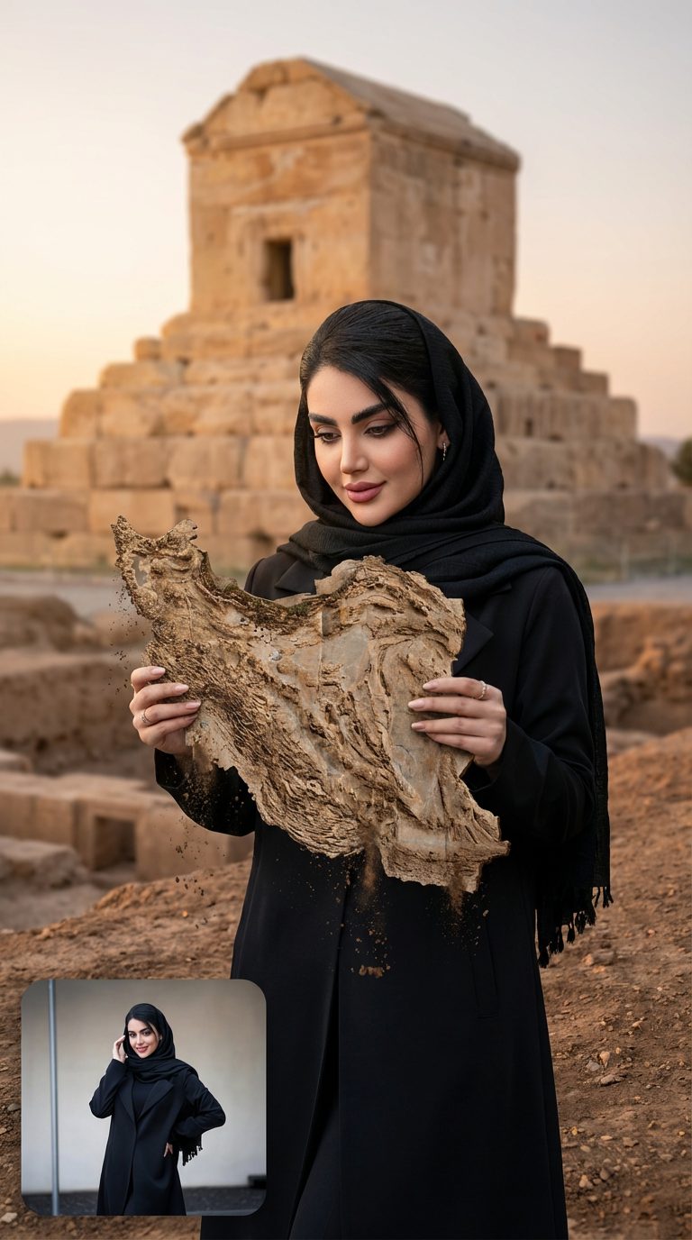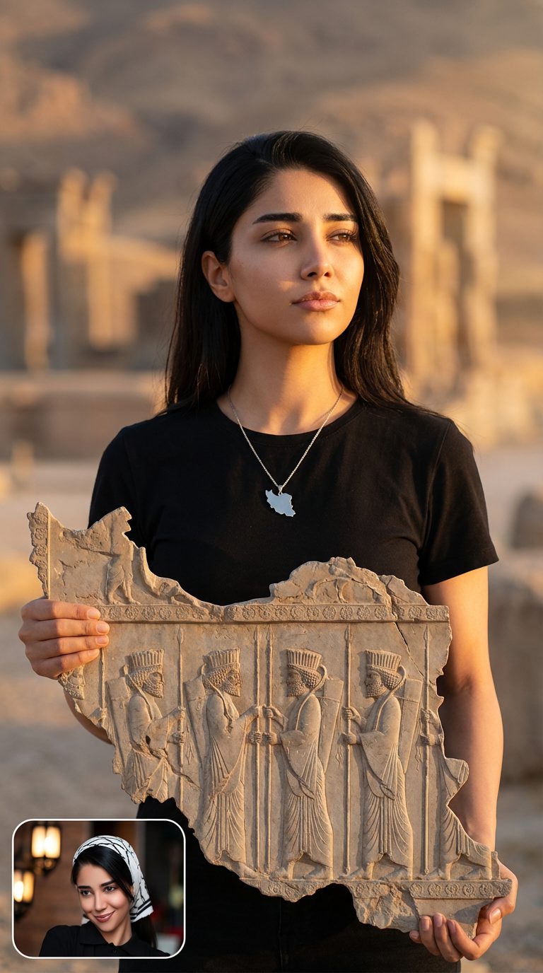 Ancient Iranian monuments such as the ruins of Persepolis and stone columns naturally emerge from the map. A calm and emotional mood that conveys love and pride. Soft natural studio lighting, warm cinematic tones, shallow depth of field, ultra-realistic skin textures, 4K quality, 9:16 vertical aspect ratio, cinematic composition, high realism.