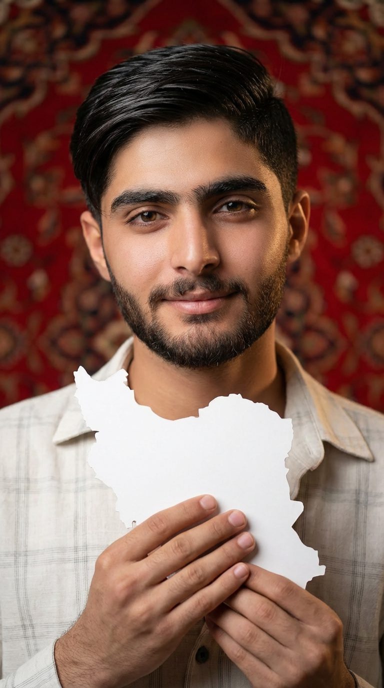 دانلودUsing the photo I have pinned for you as the main reference, create an artistic and emotional portrait. The subject is a person holding a map of Iran with both hands,