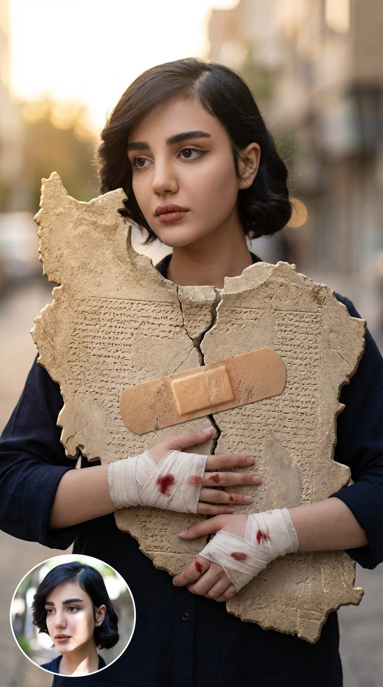 She holds a cracked clay map of Iran near her chest, with rough earthy texture and dark red nails, symbolizing homeland and identity.