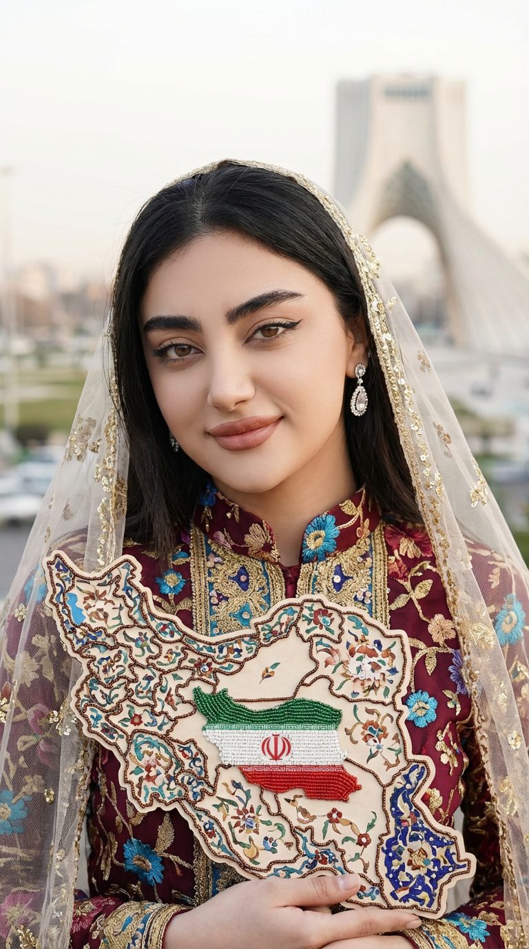 A young Iranian woman, positioned centrally, is depicted in a portrait-style composition. She is of Middle Eastern descent . She wears a traditional Iranian dress featuring a high collar and intricate floral embroidery in shades of burgundy, gold, and blue. A sheer, ornate veil covers her hair and is adorned with gold embellishments. Sparkling drop earrings are visible. holding a decorative cutout map of Iran close to their chest. The map is ornately detailed with traditional Persian floral patterns (Eslimi), beadwork texture, and features the Iranian flag in the center. Her expression is soft with a gentle smile, and she is looking towards the viewer. The background features a blurry cityscape with the Azadi Tower prominently visible, suggesting an urban setting. The lighting is soft and diffused, lending a slightly romantic atmosphere. The focus is sharp on her face and the map, while the background is somewhat softened. The overall style is photographic with a focus on capturing cultural identity.
