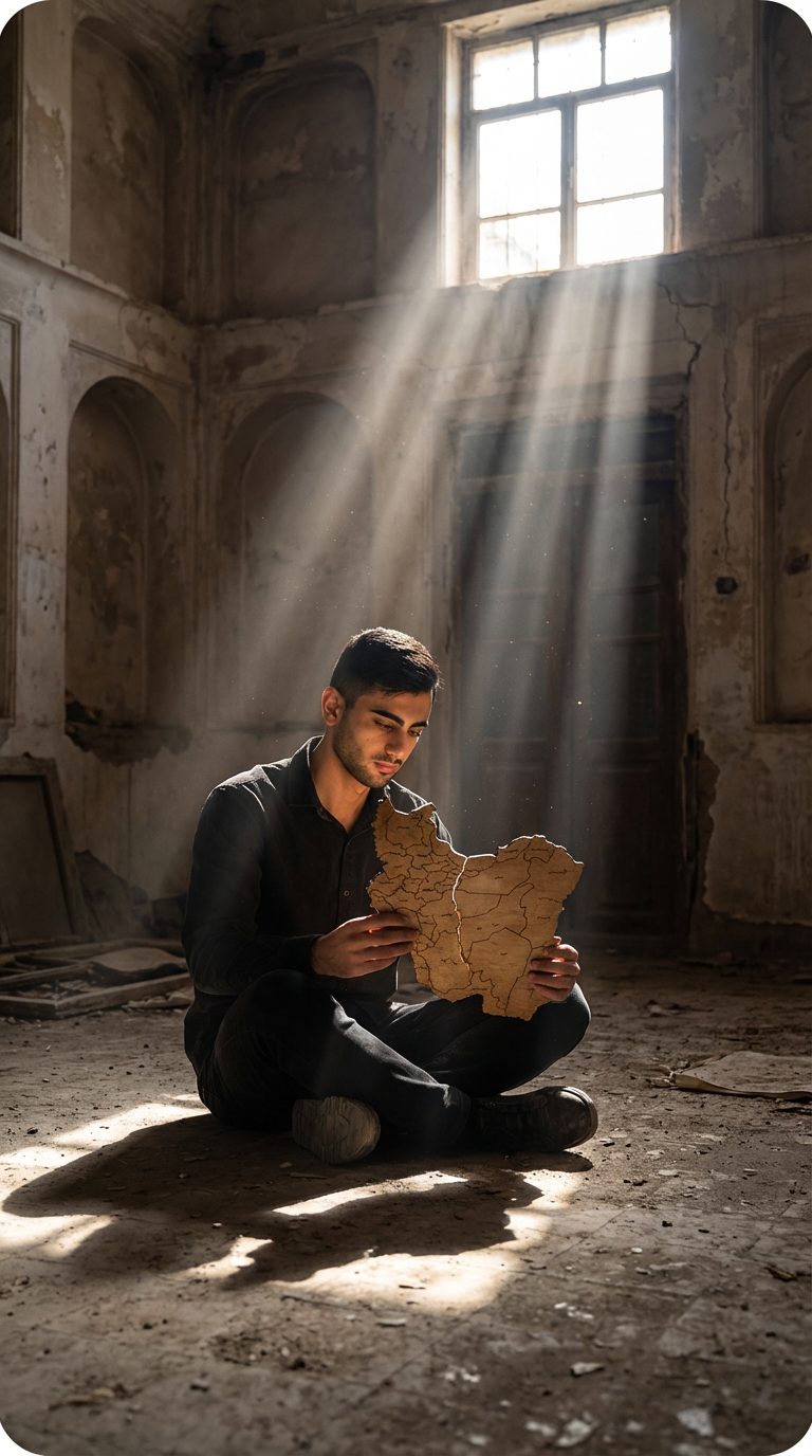 A cinematic image from an artistic film. A boy — with a face exactly matching the reference photo — is sitting on the dusty floor of a large, abandoned room in a traditional Iranian house. He is wearing simple, stylish, dark clothing.