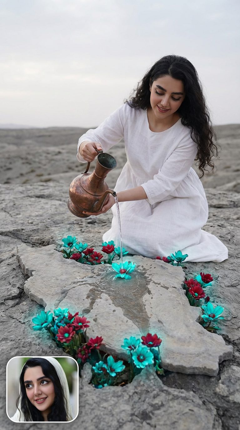 A stunningly beautiful, surreal art photo. A woman, with the exact face from the reference image, is kneeling in a vast, minimalist landscape of grey, barren rock. She is wearing an elegant, simple white linen dress. She is pouring water from a classic Persian copper ewer onto a large, flat stone shaped perfectly like the map of Iran. From every spot the water touches, vibrant, impossible flowers in shades of turquoise and deep red are miraculously blooming out of the solid rock. The lighting is soft and magical, as if from an overcast sky, making the colors of the flowers pop. Her expression is one of gentle focus and hope. The scene is poetic, powerful, and hyper-realistic."