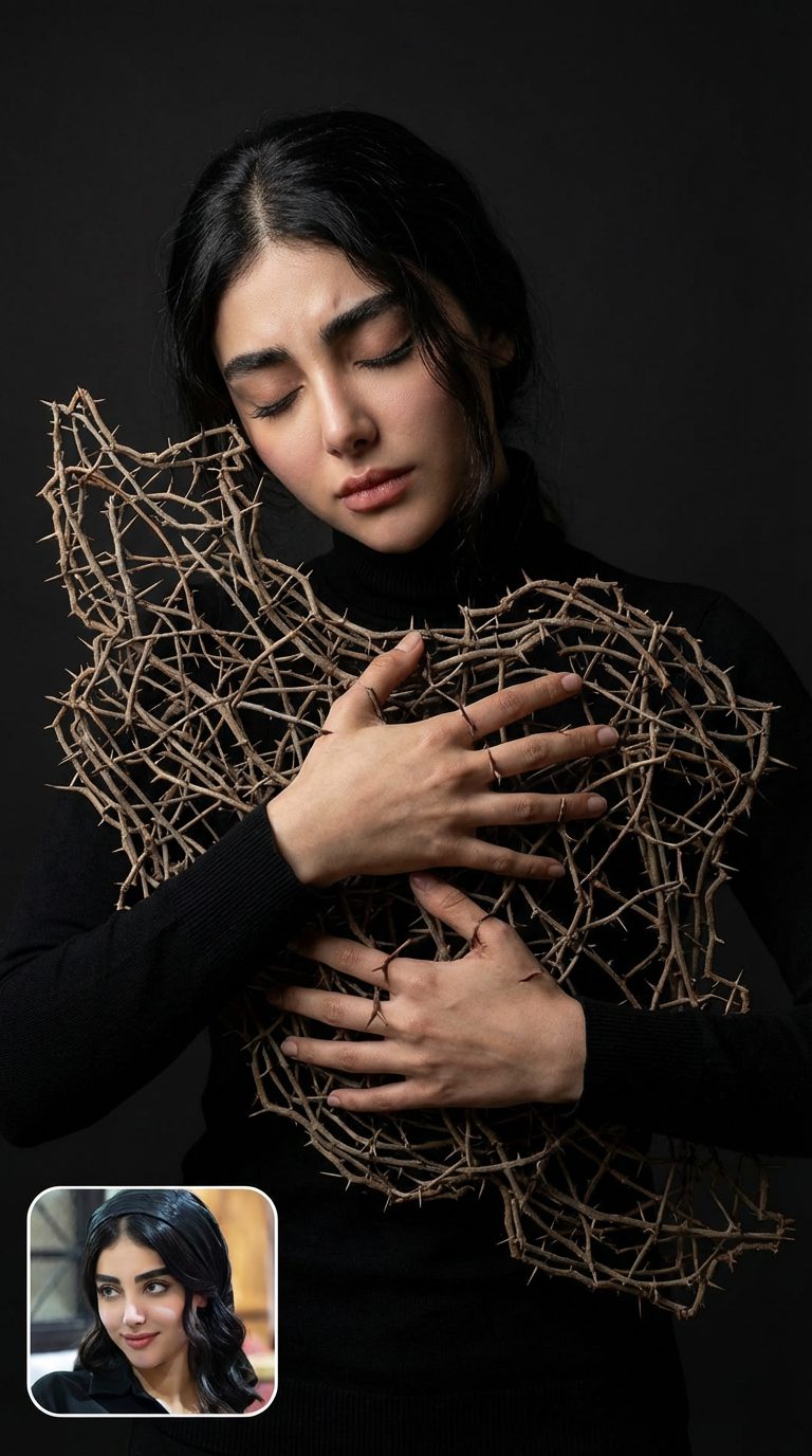 دانلودPowerful conceptual photo, ultra-realistic. A woman, maintaining the exact facial features of the reference photo, is standing against a simple dark background. She is wearing a simple black turtleneck. She is tightly embracing a map of Iran that is constructed from intertwined, thorny, barren branches. Despite the thorns pressing into her skin, she holds it protectively and tenderly. Her eyes are closed, and her expression is one of enduring pain and deep love. The lighting is soft but dramatic, focused on her face and the texture of the thorny map."