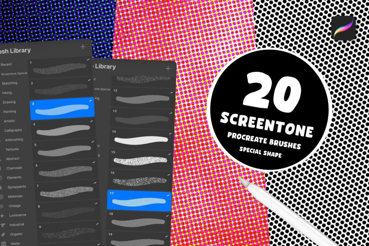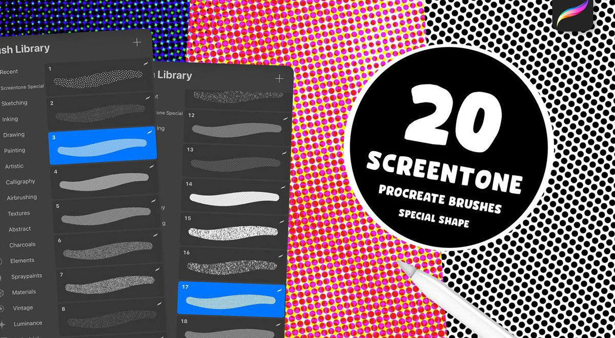قلم موهای اسکرین تون اشکال خاص پروکریت ابزارهای دیجیتالی پیشرفته ای هستند که به هنرمندان مانگا، تصویرگران و طراحان کمیک امکان می دهند تا بافت های سنتی اسکرین تون را با دقت و سهولت در آثار دیجیتال خود بازآفرینی کنند. این مجموعه ۲۰ تایی قلم مو، جوهره تکنیک اسکرین تون را به محیط دیجیتال می آورد و به شما اجازه می دهد تا بافت هایی غنی و چشم نواز خلق کنید.