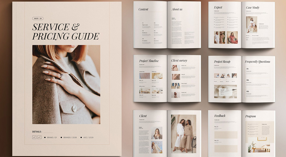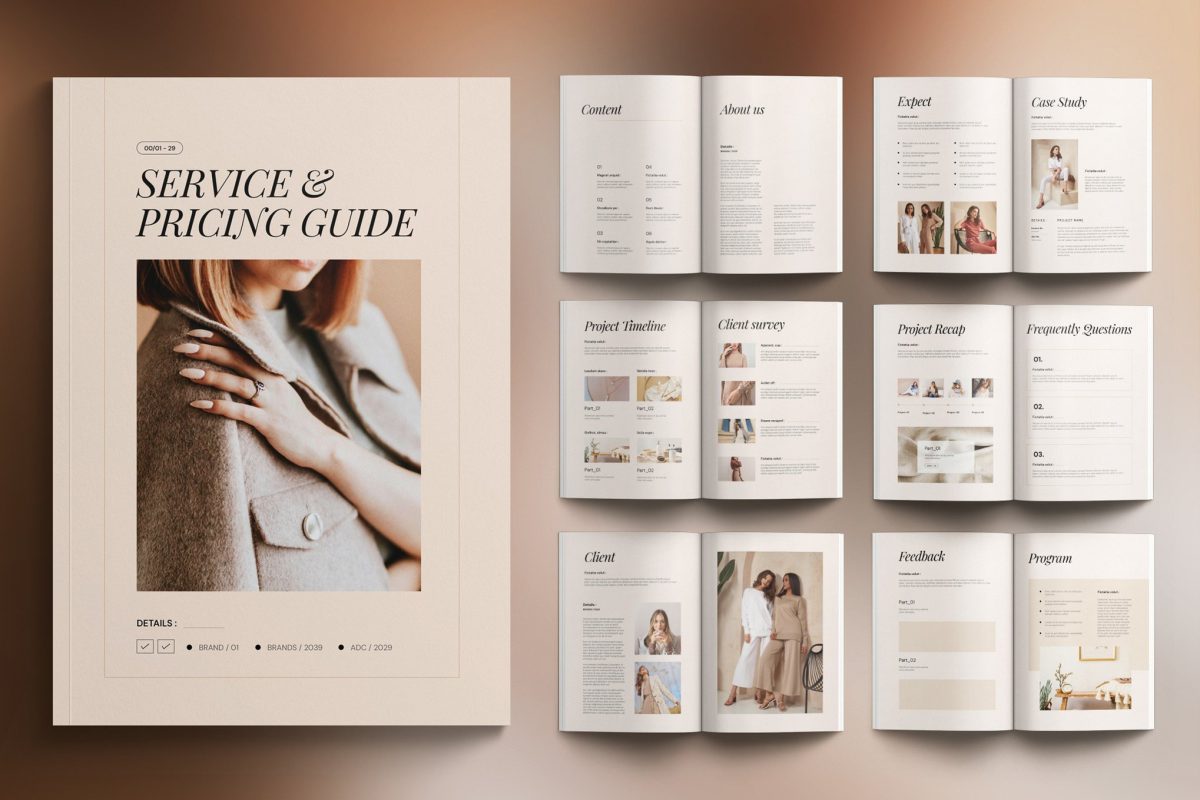 - صفحه کاور: با عنوان برجسته “SERVICE & PRICING GUIDE” و یک تصویر مرتبط با خدمات.