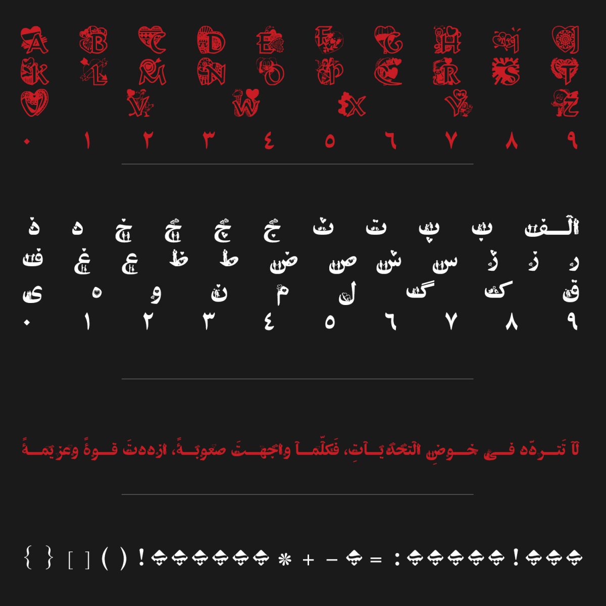 این زیبایی ها و عناصر فانتزی (نقطه های قلب شکل، اشکال قلب داخل متن، وکتورهای عاشفانه) نه تنها در حروف فارسی، بلکه هم در انگلیسی و هم اعداد نیز قرار دارد. این ویژگی، فونت های عاشق را برای پروژه هایی با محتوای چندزبانه (فارسی و انگلیسی) و حاوی اعداد، مانند طراحی کارت دعوت دوزبانه، پست های شبکه های اجتماعی با تم احساسی یا بنرهای تبلیغاتی با تم عاشقانه، بسیار کاربردی و منعطف می سازد و امکان استفاده از آن ها را در طیف وسیعی از پروژه ها فراهم می کند.