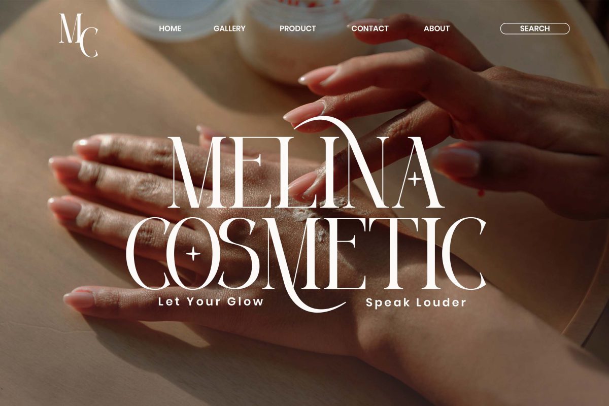 - برندینگ و تبلیغات: ایده آل برای برندینگ محصولات لوکس، طراحی لوگو (مانند آنچه در تصویر برای “MELINA COSMETIC” با شعار “Let Your Glow Speak Louder” دیده می شود) و ایجاد هویت بصری قوی برای شرکت ها.