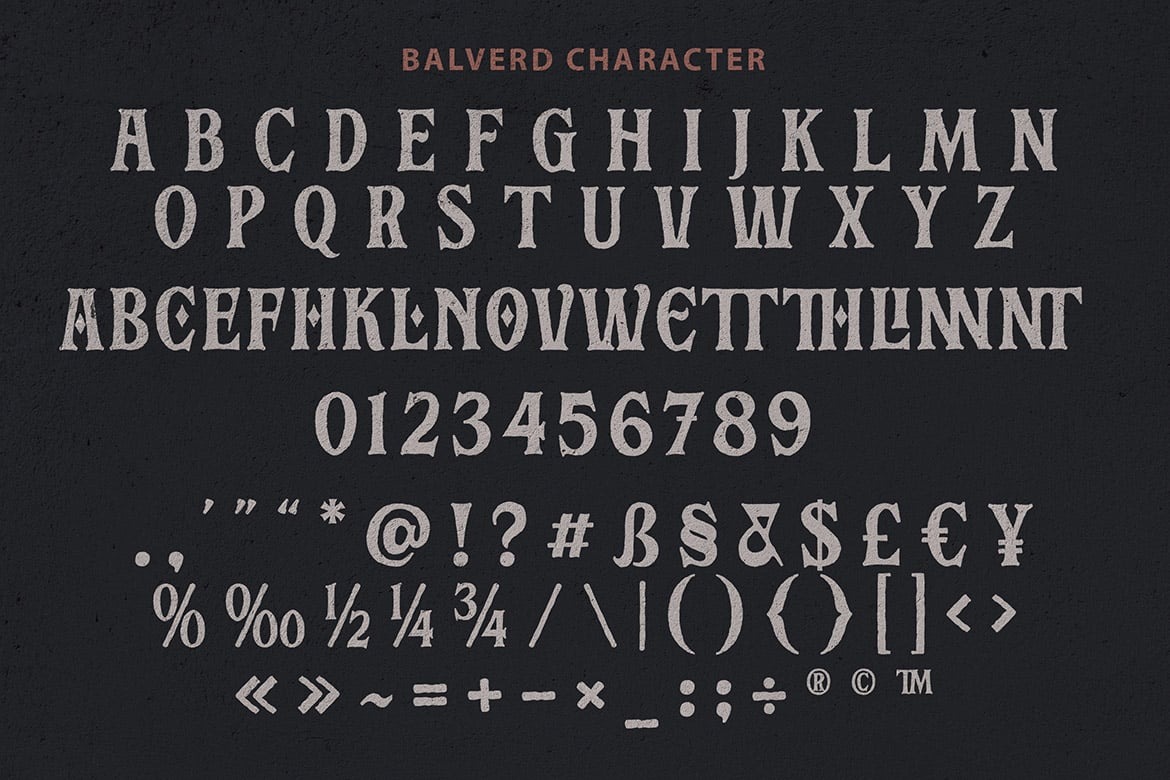 فونت Balverd، یک تایپ فیس با سبک وینتج (Vintage Style) است که توسط Blankids Studio خلق شده است. این قلم سریف، با الهام از زیبایی شناسی گذشته، برای افزودن حسی از اصالت و کلاسیک بودن به پروژه های بصری شما طراحی شده است. همانطور که در نمونه های بصری (تصاویر ارائه شده) مشاهده می شود، حروف بزرگ و کوچک Balverd دارای طراحی های منحصر به فردی هستند که یادآور سبک های قدیمی و رتو (Retro) می باشند. به عنوان مثال، حروف بزرگ “A”, “B”, “E”, “F”, “H”, “K”, “L”, “N”, “O”, “V”, “W”, “T” (با دندانه های خاص) و “M” (با پایه های پهن) در تصویر “BALVERD CHARACTER” به وضوح این ویژگی وینتج را نشان می دهند.