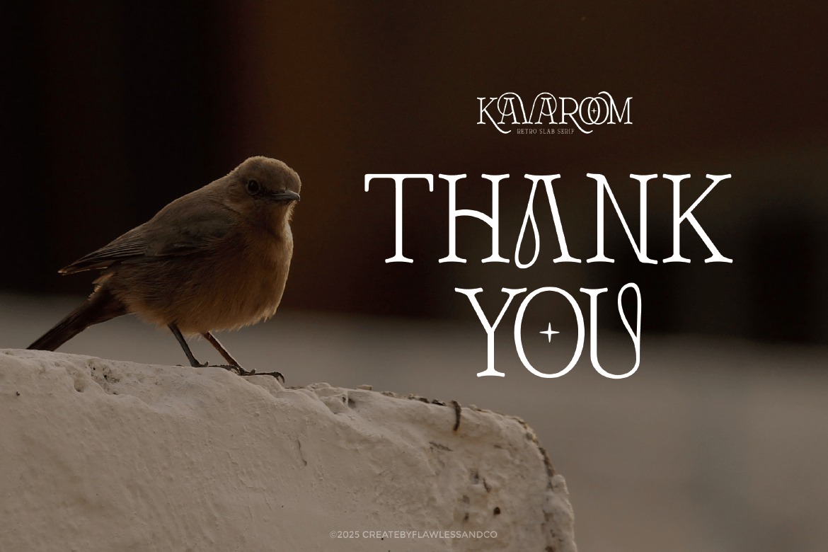 همانطور که در تصاویر نمونه مشاهده می شود، Kavaroom دارای فرم های حروف خاص و منحصر به فرد است. در تصویر “PUNCTUATION, ALTERNATE, & LIGATURE”، می توان جزئیات منحنی و لیگاتورهای (Ligatures) با دقت طراحی شده را دید که حروف را به هم متصل می کنند و ظاهری هنری و یکپارچه ایجاد می کنند. به عنوان مثال، نحوه اتصال حروف “K” و “A” و “R” در لوگوتایپ “KAVAROOM” در تصویر “PROUDLY PRESENT KAVAROOM” به وضوح این ویژگی ها را نشان می دهد. حروف بزرگ و کوچک و همچنین اعداد و علائم نگارشی (“UPPERCASE, LOWERCASE, & NUMERICAL”) با دقت طراحی شده اند تا خوانایی و زیبایی را در کنار هم داشته باشند.