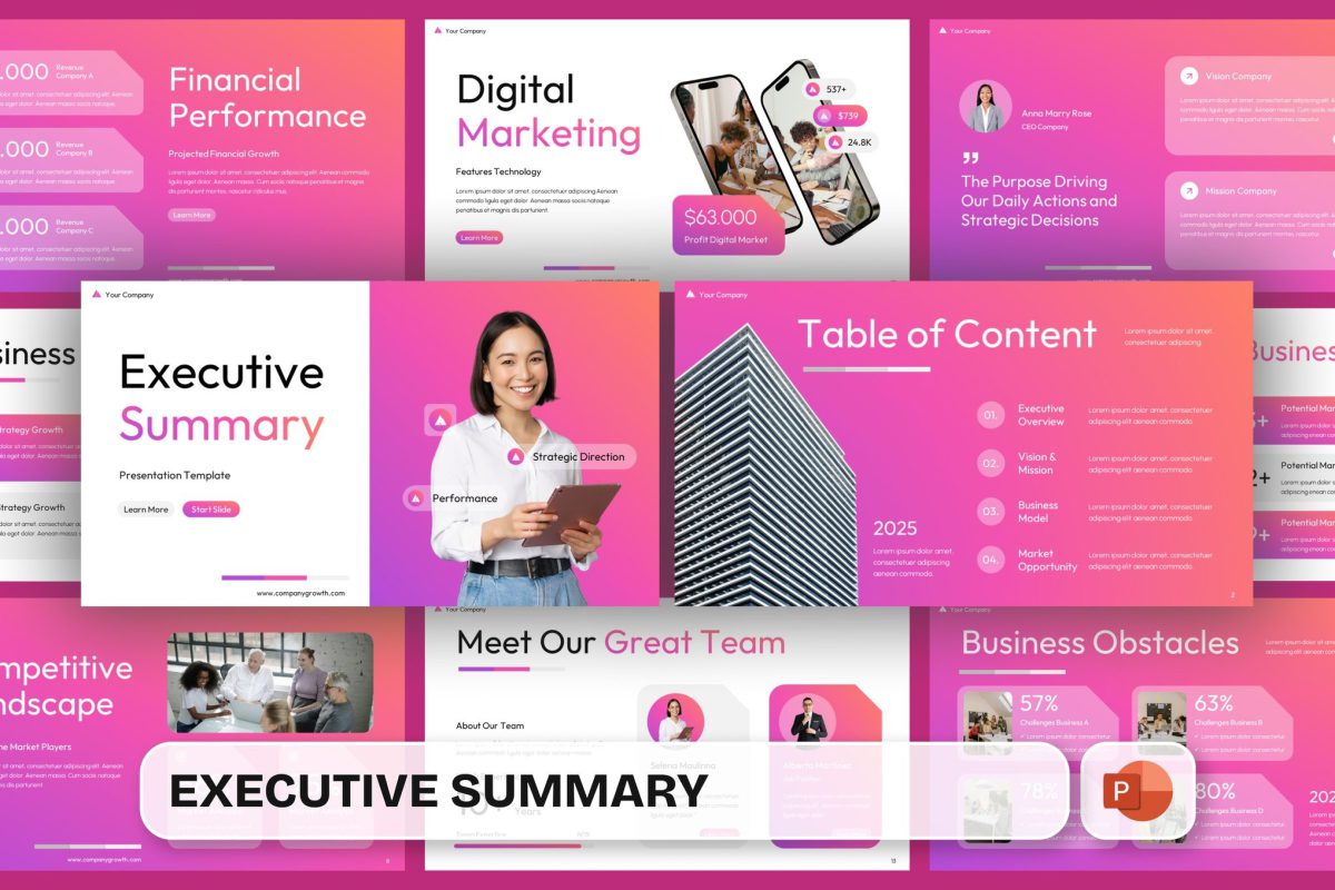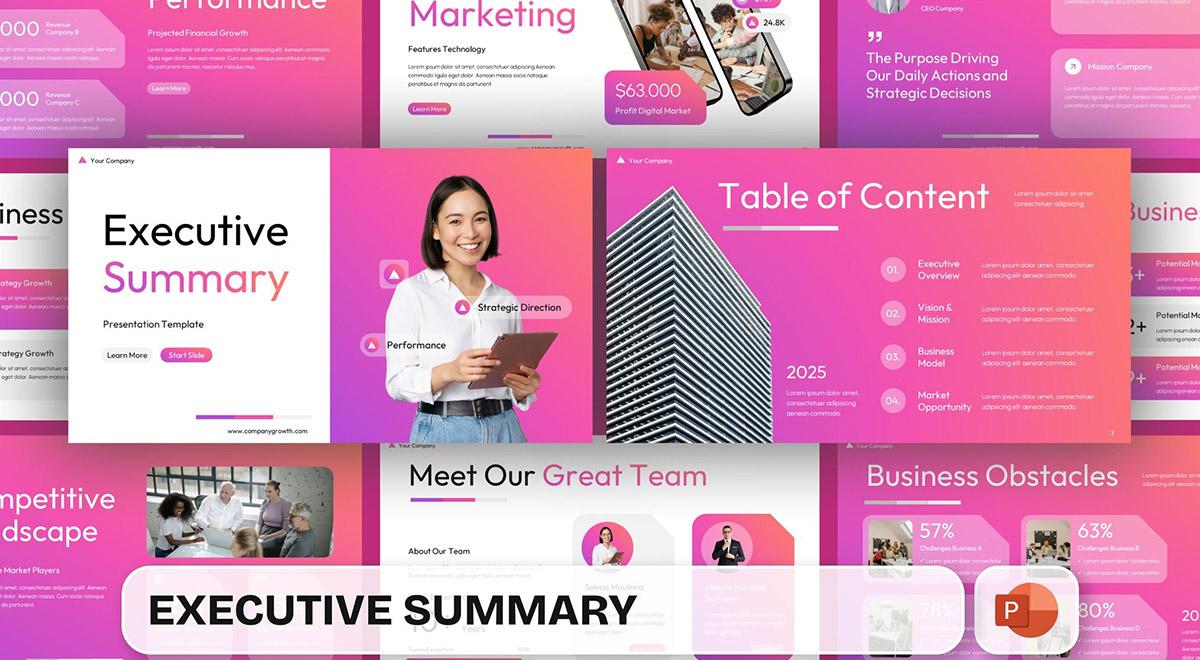 قالب پاورپوینت Executive Summary در طیف وسیعی از ارائه ها و برنامه های گرافیکی، چه در محیط ویندوز و چه در پلتفرم های موبایل، کاربرد دارد: