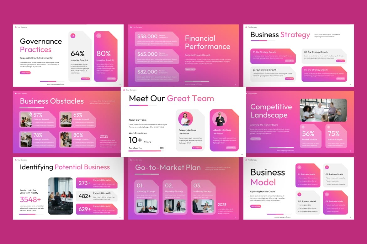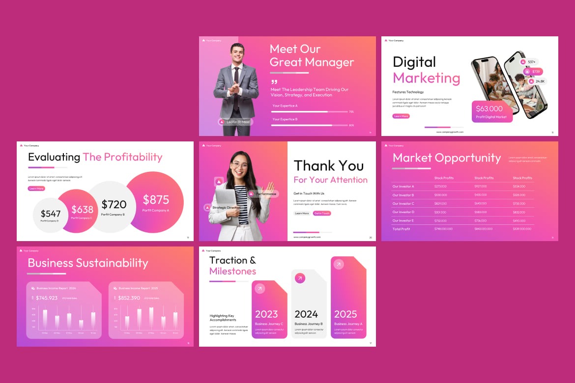 - در محیط ویندوز (Microsoft PowerPoint): این قالب به طور خاص برای استفاده در Microsoft PowerPoint بهینه سازی شده است. شما می توانید از آن برای جلسات هیئت مدیره، جمع بندی پروژه ها، ارائه های سرمایه گذاران، بررسی های استراتژیک، گزارش های ماهانه و فصلی و گزارش های مشاوره استفاده کنید. تمام اسلایدها قابلیت ویرایش کامل دارند و می توانید به راحتی داده های خود را جایگزین کنید.
