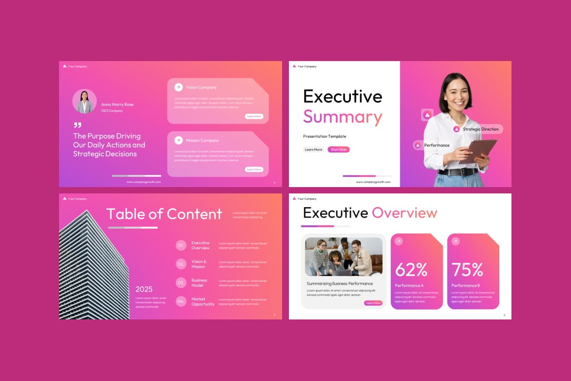 استفاده از قالب پاورپوینت Executive Summary بسیار آسان است و به شما کمک می کند تا به سرعت یک ارائه حرفه ای بسازید: