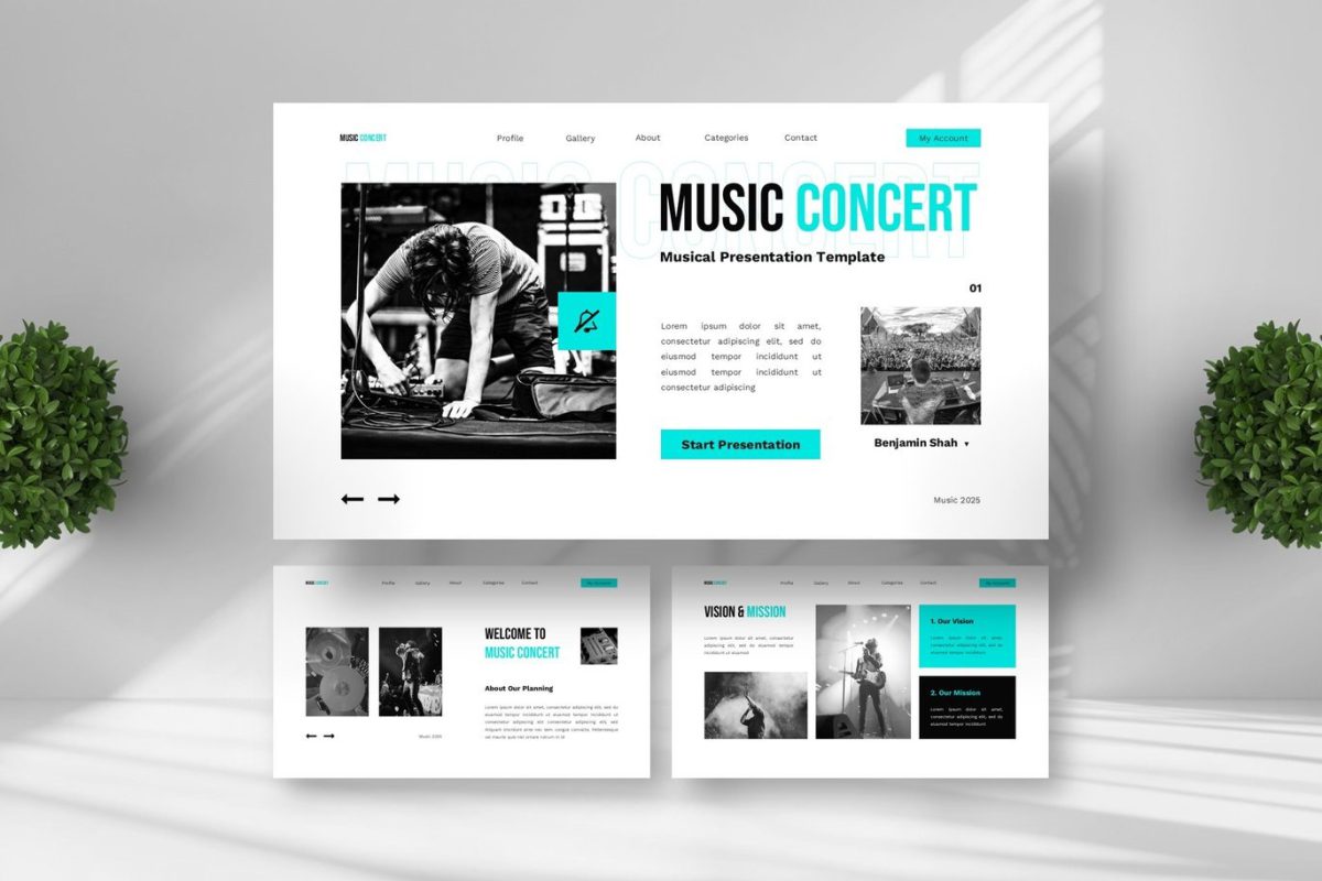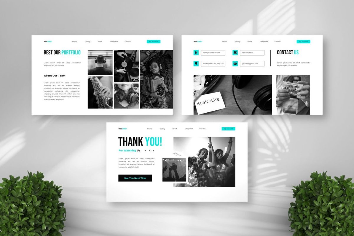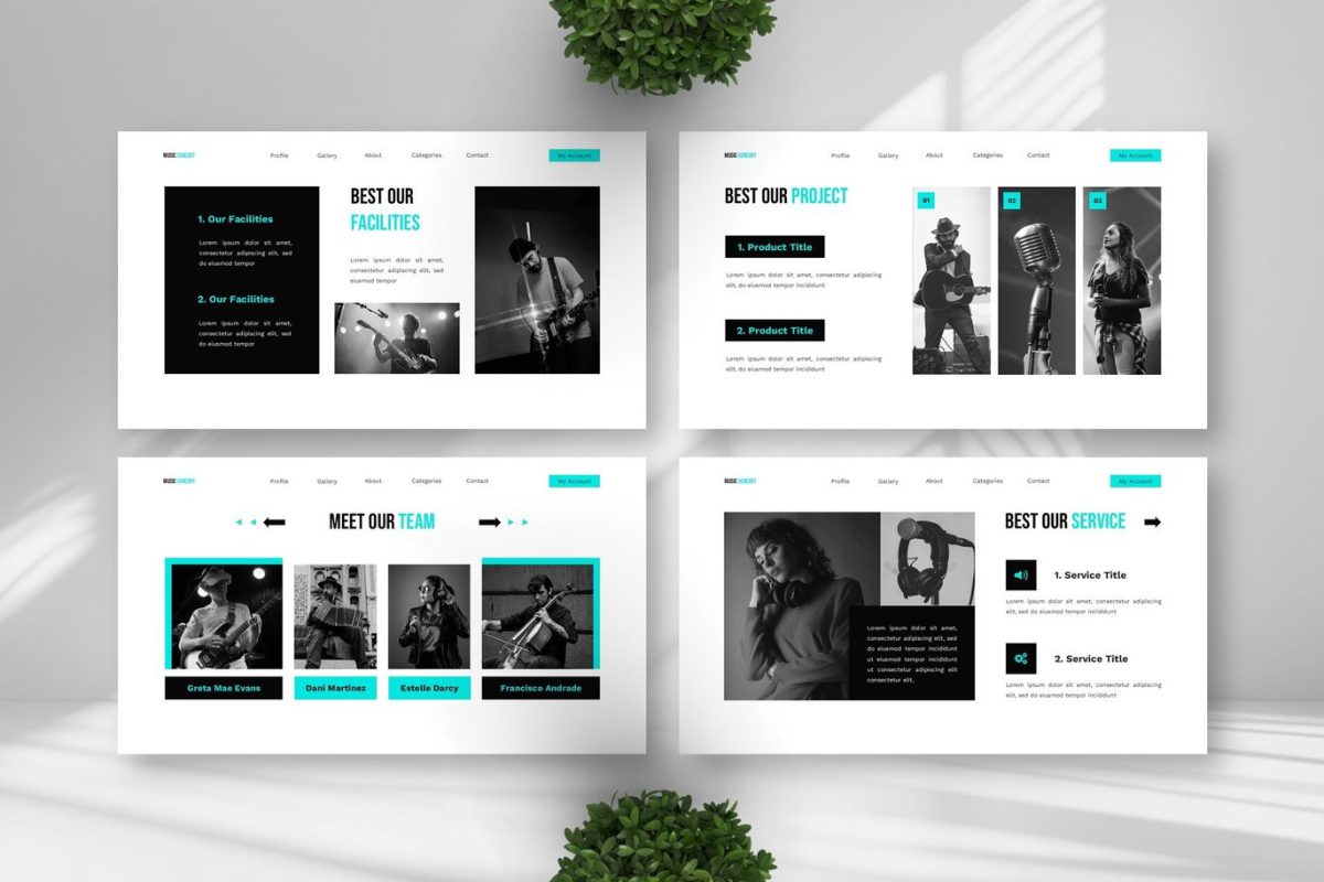با مشاهده تصاویر نمونه، می توان دید که این قالب از طراحی مدرن و مینیمال با استفاده از رنگ های آبی فیروزه ای، مشکی و سفید بهره می برد که حس پویایی و حرفه ای بودن را القا می کند. اسلایدها شامل تصاویر با کیفیت بالا از نوازندگان، دی جی ها و صحنه های کنسرت هستند که به جذابیت بصری قالب می افزایند. قالب دارای اسلایدهایی برای معرفی هنرمندان، نمایش آلبوم ها، بخش های تماس با ما و گالری تصاویر است. به عنوان مثال، در تصویر اول، یک نوازنده در حال تنظیم تجهیزات موسیقی در یک نمای نزدیک دیده می شود که حس آماده سازی برای یک رویداد را منتقل می کند. در تصویر دوم، اسلایدهایی با عنوان “BEST OUR FACILITIES” و “MEET OUR TEAM” دیده می شود که نشان دهنده قابلیت قالب برای معرفی امکانات و اعضای گروه است. تصویر سوم نیز اسلایدهایی برای “BEST OUR PORTFOLIO” و “CONTACT US” دارد که برای نمایش نمونه کارها و اطلاعات تماس مناسب است.