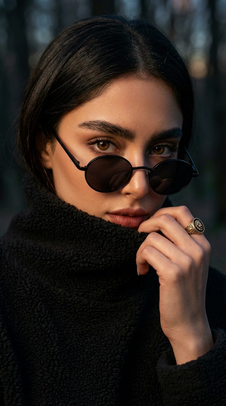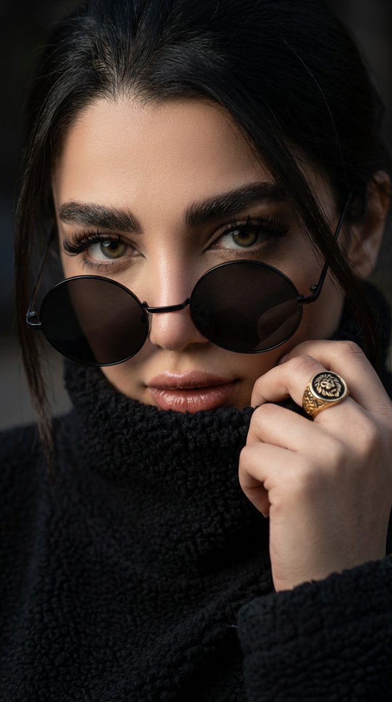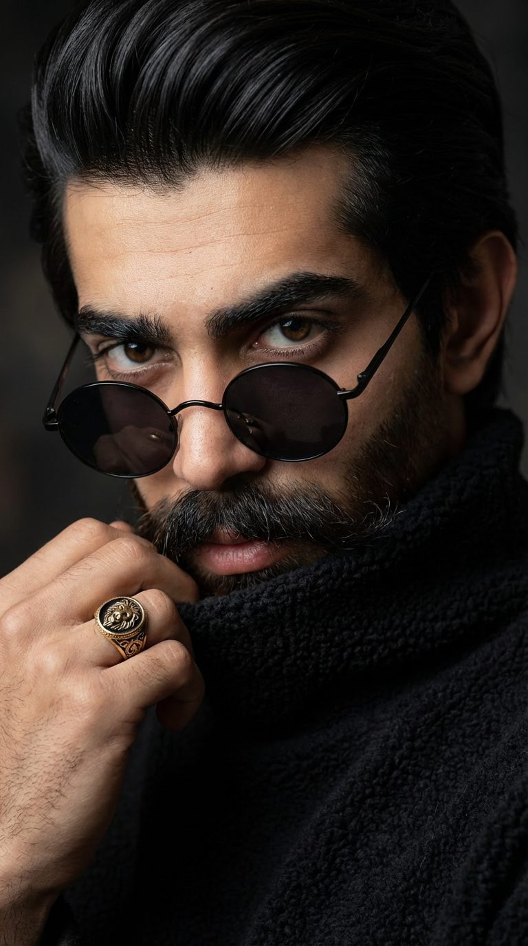 دانلود پرامپت جادویی پرتره با یقه اسکی عینک دودی و انگشتر طلایی