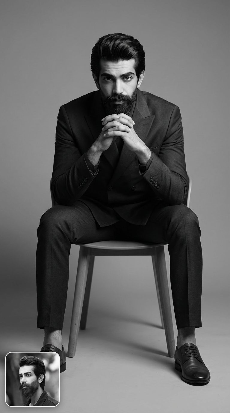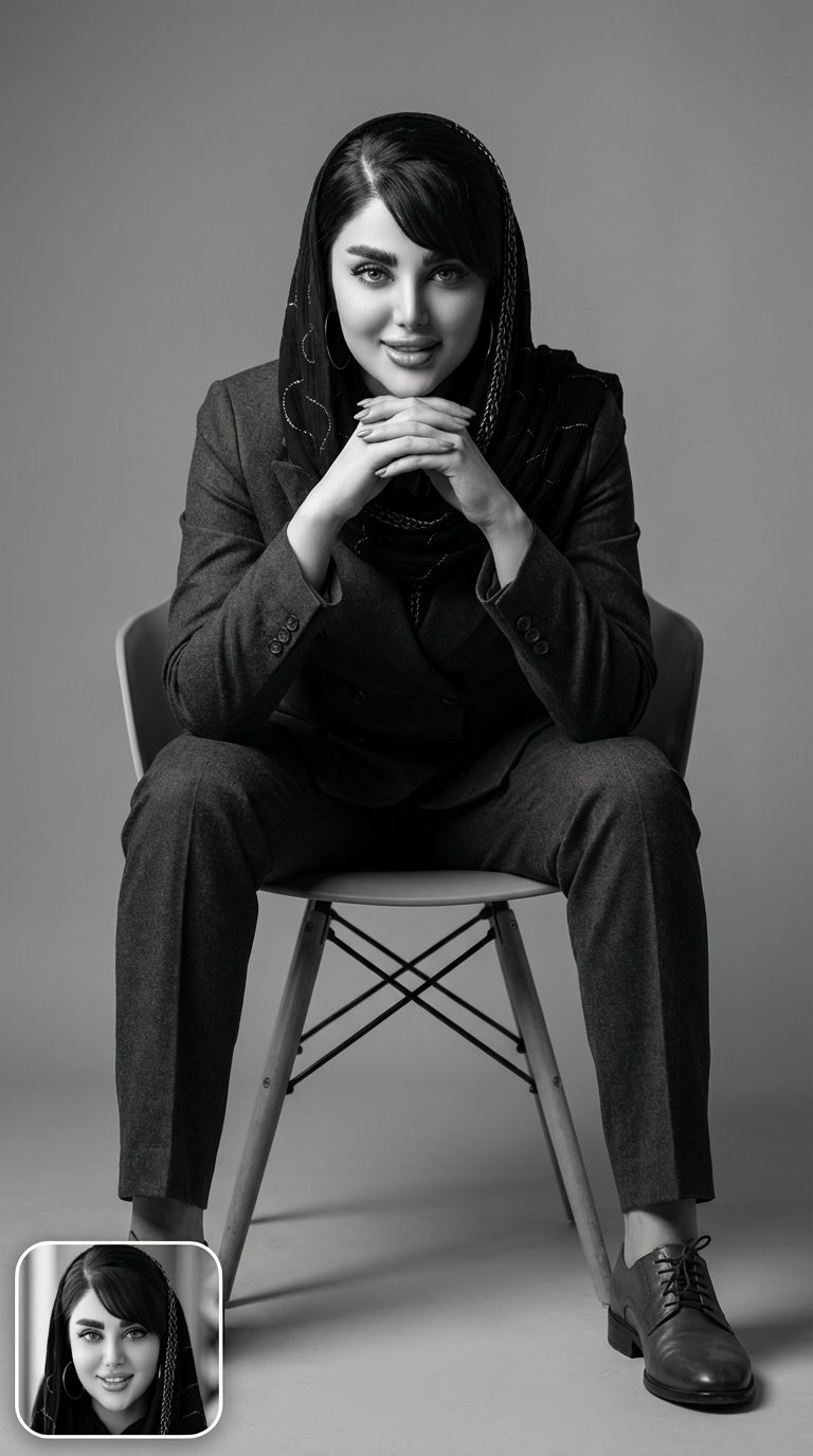 دانلود1 نظر برای پرامپت پرتره سیاه و سفید نشسته روی صندلی استودیویی