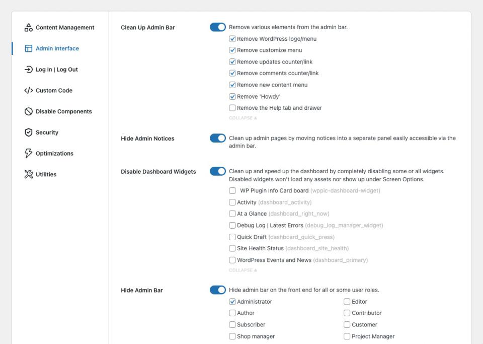 - خداحافظی با شلوغی: پنل مدیریت وردپرس را از شر عناصر و بخشهای اضافی که هرگز از آنها استفاده نمیکنید، رهایی بخشید. با ASE Pro، میتوانید به راحتی نوار ابزار ادمین، اعلانهای مزاحم و ابزارکهای غیرضروری را پنهان کنید و فضایی خلوت و کاربرپسند برای مدیریت وبسایت خود ایجاد نمایید.