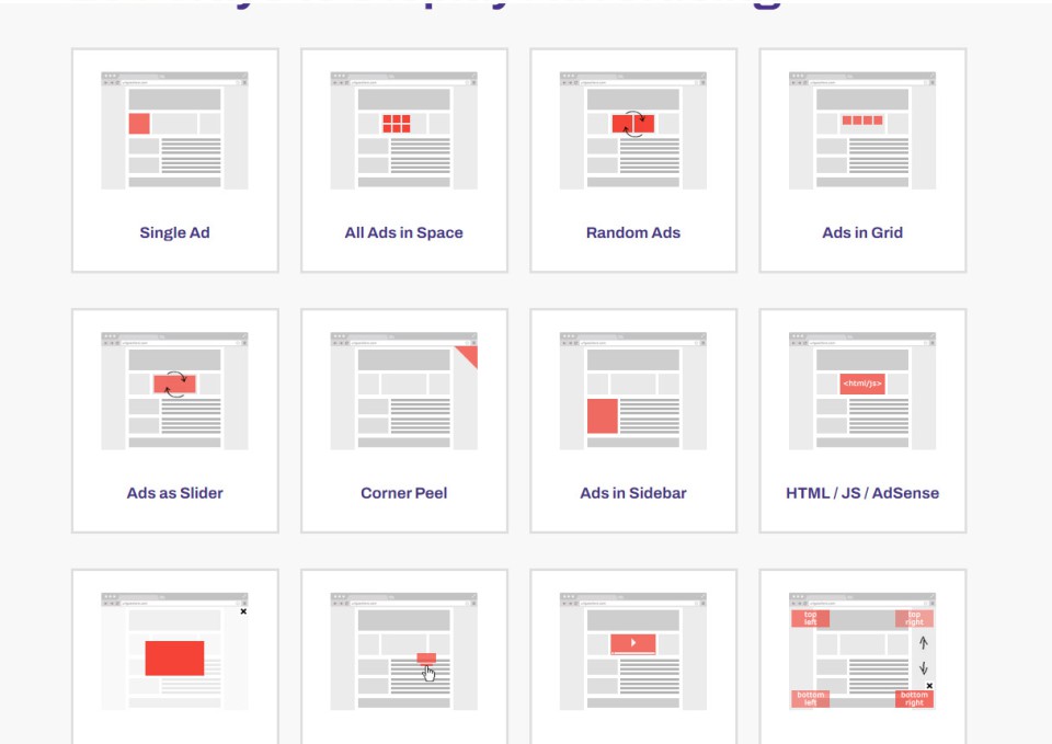 - انواع نمایش تبلیغات: با Ads Pro، میتوانید تبلیغات خود را به 20 روش مختلف در وبسایت خود نمایش دهید. این روش ها شامل سایدبار، شناور، ویدئو، پس زمینه، گوشه صفحه و بسیاری موارد دیگر میشوند.
