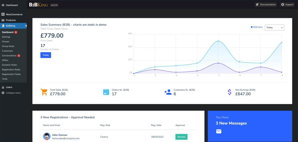 اینجاست که B2BKing، یک پلاگین جادویی برای ووکامرس، وارد معادله می شود. B2BKing با مجموعه ای قدرتمند از ویژگی ها، به شما این امکان را می دهد که فروشگاه آنلاین B2B خود را به طور کامل مدیریت کنید و تجربه ای استثنایی برای مشتریان تجاری خود رقم بزنید.