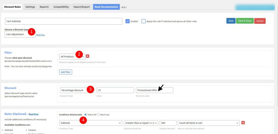 - ذخیره و انتشار قانون: پس از اتمام تنظیمات، قانون تخفیف خود را ذخیره و منتشر کنید.
