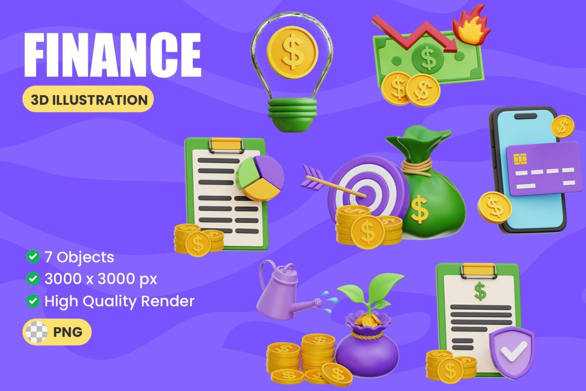 مجموعه “Finance 3D Illustration” شامل هفت نماد سه بعدی با کیفیت رندر بالا است که به طور خاص برای پروژه های مرتبط با امور مالی طراحی شده اند. این تصاویر با رنگ بندی غالب بنفش و سبز، در کنار جزئیات طلایی رنگ سکه ها و نمادهای دلار، جلوه ای مدرن و در عین حال دوستانه به مفاهیم مالی می بخشند. هر یک از این آیکن ها بدون پس زمینه (فرمت PNG) ارائه شده اند که امکان ادغام آسان آن ها را در انواع طرح ها فراهم می کند. ابعاد هر تصویر ۳۰۰۰x۳۰۰۰ پیکسل است که وضوح و جزئیات فوق العاده ای را تضمین می کند و آن ها را برای استفاده در رزولوشن های بالا مناسب می سازد.