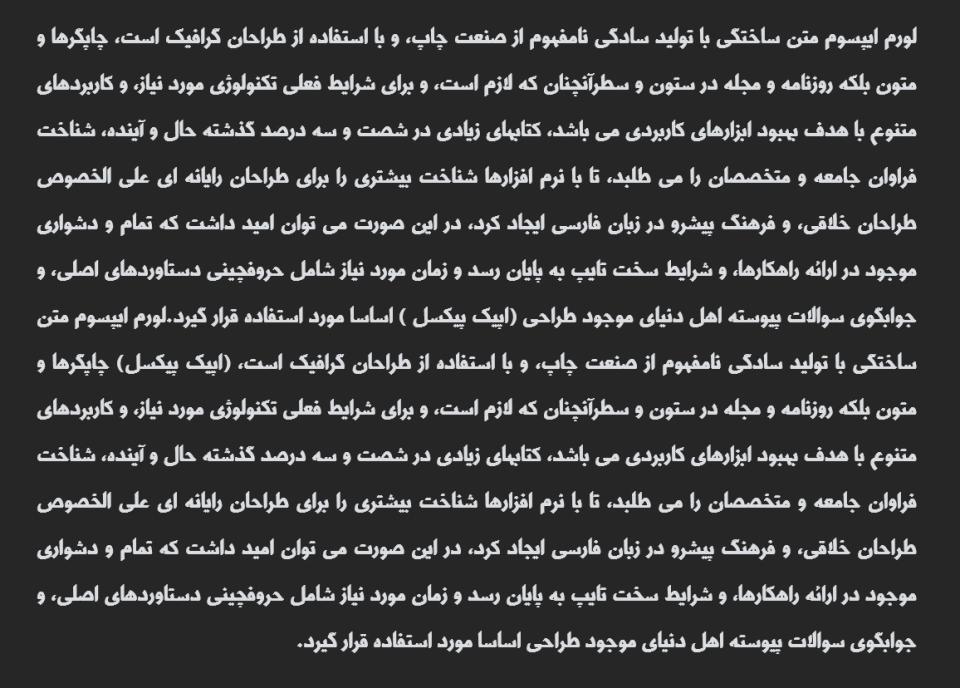 فونت چهر فارسی، با طراحی منحصربه فردش، جان تازه ای به نوشته های شما می بخشد. این فونت، با ساختار هندسی دقیق حروف و خطوط نرم و دلنشین، خوانایی بالایی را هم در متن های طولانی و هم در عناوین کوتاه ارائه می دهد. اگر به دنبال فونتی هستید که هم در طراحی های مدرن و هم در پروژه های سنتی تر به خوبی بنشیند، چهر انتخابی ایده آل است.