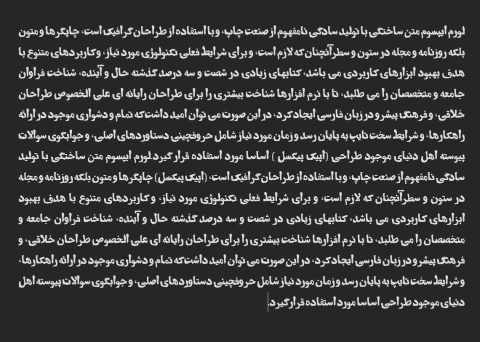 فونت داغون فارسی، یه انتخاب جسورانه برای طراحیه که می خواد کارش متفاوت و چشمگیر باشه. این فونت با طراحی خاص و منحصربه فردش، حس قدرت و استحکام رو به مخاطب القا می کنه و برای طراحی هایی مثل لوگو، پوستر، بنر و حتی عناوین وب سایت ها که نیاز به یه ظاهر قوی و متمایز دارن، ایده آله.