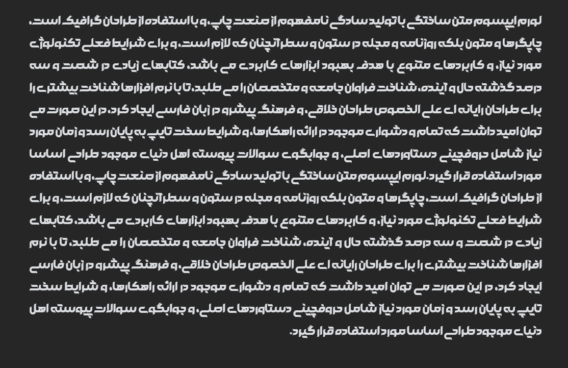 تنوع در سبک ها: فونت گلستان در چندین سبک مختلف طراحی شده است که شامل سبک های نازک، نیمه نازک، معمولی، ضخیم و خیلی ضخیم می شود. این تنوع باعث می شود که این فونت برای انواع محتواهای مختلف مناسب باشد.