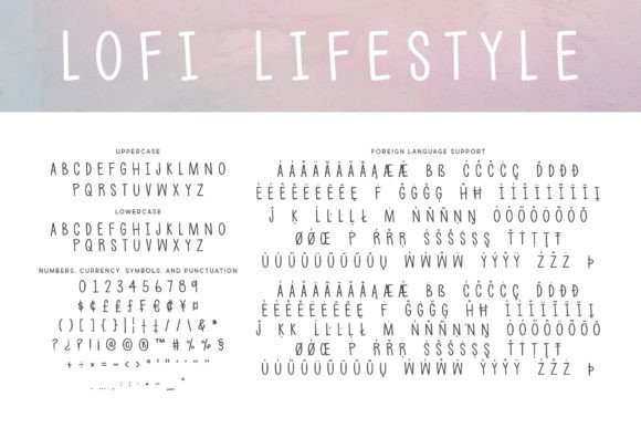 با بیش از 330 علامت، فونت LoFi Lifestyle از اکثر زبان های مبتنی بر لاتین پشتیبانی می کند و نسخه کامل شامل اعداد و علائم نگارشی است که شما نیاز دارید. استفاده از ستاره (*) به شما یک نماد هدفون سرگرم کننده می دهد که می توانید در پروژه های خود از آن استفاده کنید. |