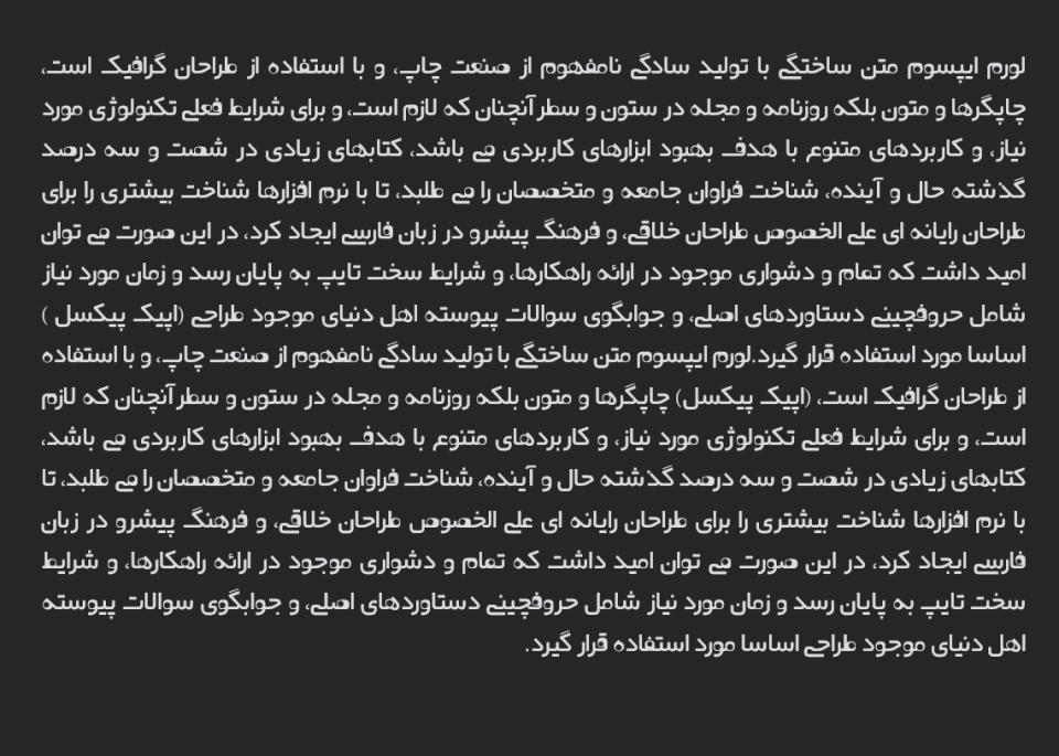 فونت رضوان، با طراحی خاص و منحصربه فردش، گزینه ای ایده آل برای طراحانی است که به دنبال جلوه ای مدرن و در عین حال خوانا در آثار خود هستند. این فونت، با داشتن اعراب و پشتیبانی کامل از حروف فارسی و عربی، خیال شما را از بابت نمایش صحیح متون در هر اندازه ای راحت می کند.