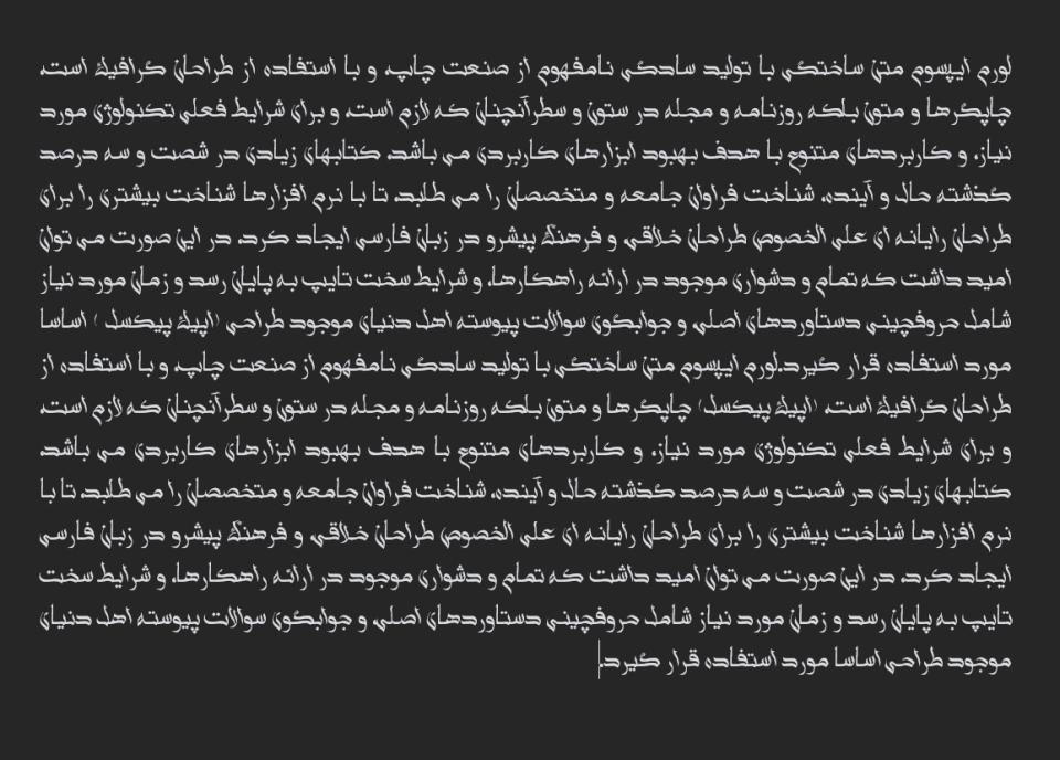 البته این ظاهر خاص، ممکن است برای هر نوع متنی مناسب نباشد. به دلیل بهم ریختگی حروف، خوانایی متن در اندازه های کوچک ممکن است کمی دشوار باشد. بنابراین، توصیه می شود از این فونت بیشتر در عناوین، تیترها و نوشته های کوتاه استفاده کنید تا هم زیبایی آن به چشم بیاید و هم خوانایی متن حفظ شود. در واقع، بهترین کاربرد این فونت در جاهایی است که می خواهید تاکید ویژه ای روی متن داشته باشید و نگاه مخاطب را به خود جلب کنید.