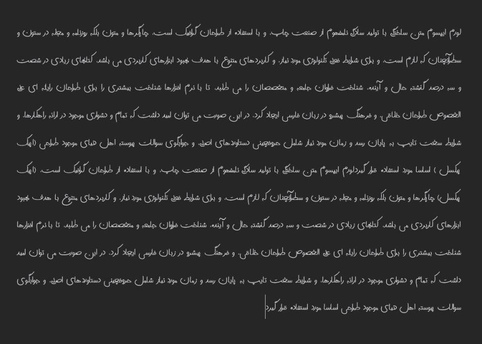 یکی از ویژگی های خوب زلفون، خوانایی بالای اونه، با وجود اینکه ظاهرش دست نویسه، اما به راحتی می شه متن ها رو خوند. این یعنی هم می تونید تو طراحی های گرافیکی ازش استفاده کنید و هم تو متن های طولانی تر. البته یه نکته هم هست، شاید زلفون برای متن های خیلی رسمی یا علمی چندان مناسب نباشه، چون ذاتش یه حس خودمونی و دوستانه داره.