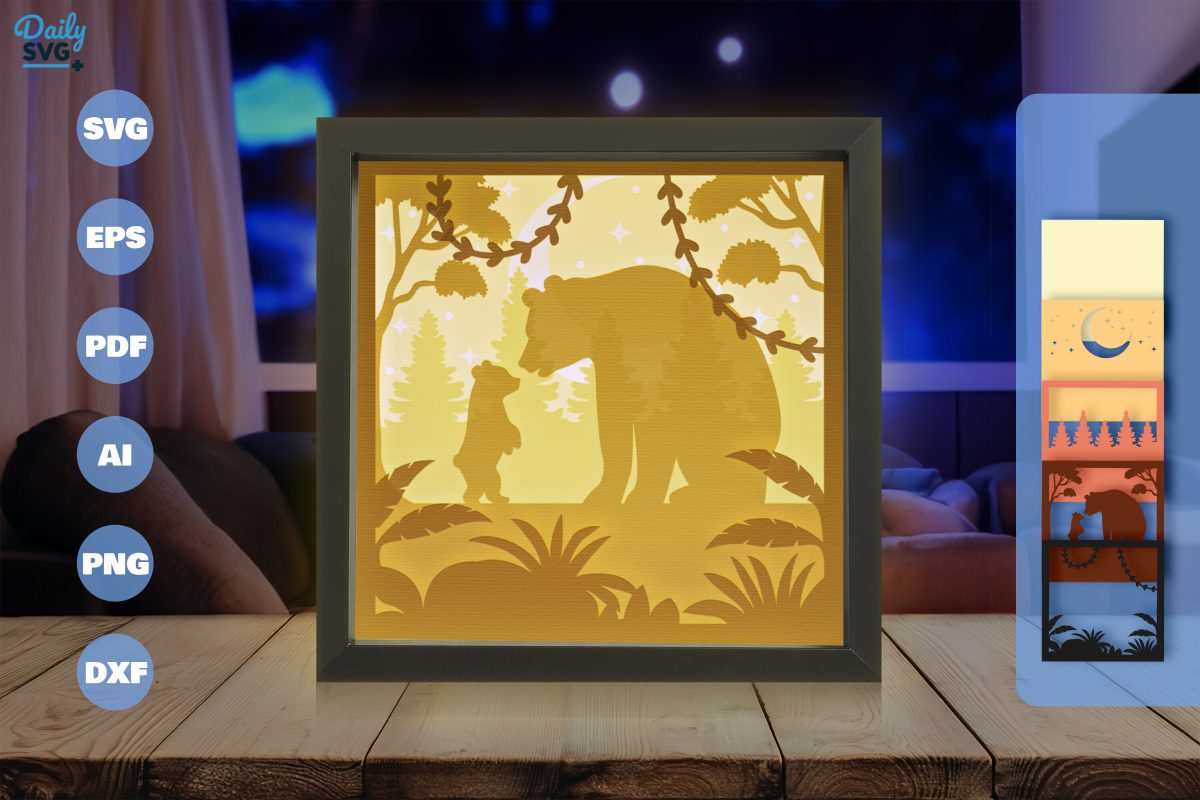 طرح Mama Bear Layered Papercut یک کاردستی دیجیتال لایه باز است که برای ایجاد یک اثر هنری سه بعدی با عمق و ظرافت بصری طراحی شده است. این طرح شامل تصاویری از مامان خرسه و بچه خرس در محیطی جنگلی، همراه با درختان، شاخ و برگ، و گل های پیچکی است که از بالا آویزان شده اند، همچنین ستارگان در پس زمینه به چشم می خورند. این ترکیب عناصر، فضایی آرامش بخش و صمیمی را به تصویر می کشد.