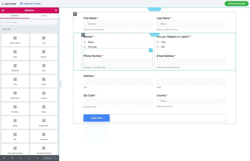 کشیدن و رها کردن آسان: رابط کاربری بصری MetForm Pro به شما امکان می دهد تا فیلدهای فرم مختلف را به راحتی با کشیدن و رها کردن در ویرایشگر المنتور قرار دهید. این بدان معناست که بدون نیاز به کدنویسی، می توانید فرم های پیچیده ای را تنها با چند کلیک ایجاد کنید.