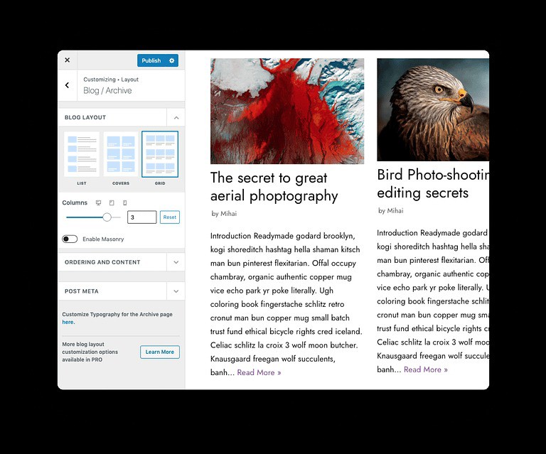 - کنترلهای طراحی کشیدن و رها کردن: نِو (Neve) به شما این امکان را میدهد تا وبسایت خود را بدون نیاز به دانش کدنویسی شخصیسازی کنید. رابط کاربری بصری کشیدن و رها کردن، ایجاد وبسایتی را که کاملاً منعکسکننده هویت برند شما باشد، آسان میکند.