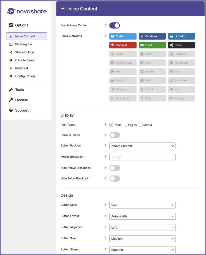 - رابط کاربری آسان: Novashare نیازی به تنظیمات پیچیده ندارد. به سادگی افزونه را فعال کنید، دکمه های اشتراک گذاری مورد نظر خود را انتخاب کنید و آنها را با چند کلیک در وب سایت خود قرار دهید.