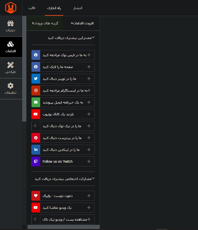 پس از تکميل جزئيات هديۀ خود، شما به صفحه Actions خواهيد رفت كه در آن ميتوانيد اقداماتي را كه شركت كنندگان بايد براي كسب نقطۀ و شانس بيشتر در قرعه كشي انجام دهند، تعريف كنيد. در این صفحه، شما میتوانید از عناصر کشیدن و رها کردن (Drag and drop) استفاده کنید تا اقدامات دلخواه خود را به سادگی به هدیه خود اضافه کنید. بعضي از عناسير موجود عبارتاند از: