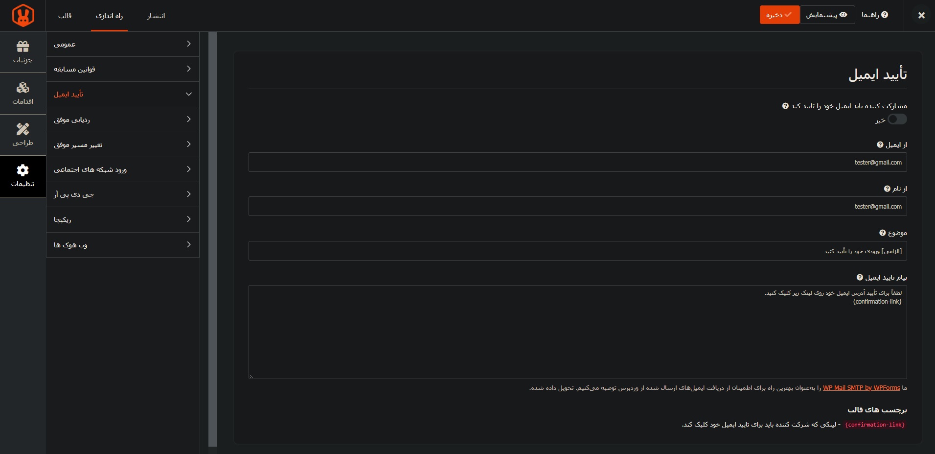 GDPR: در این بخش، شما میتوانید تنظیمات مربوط به حفظ حریم خصوصی و رعایت قوانین GDPR را انجام دهید. شما میتوانید گزینهای را فعال کنید که به شرکتکنندگان اجازه میدهد تا رضایت خود را از جمعآوری دادههای شخصی نشان دهند و یا از شرکت در هدیه منصرف شوند.