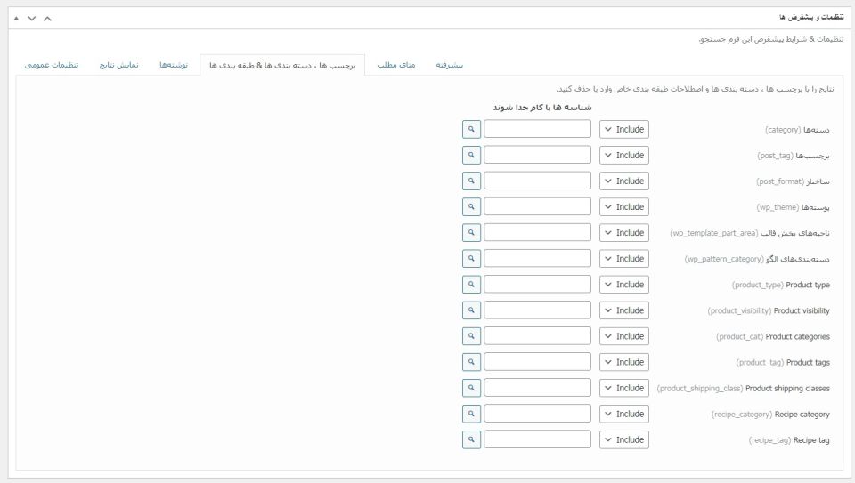 برای پنهان کردن برچسب ها، دسته ها و طبقه بندی ها از نتایج جستجو، باید به تنظیمات Search & Filter Pro بروید و گزینه “نمایش برچسب ها، دسته ها و طبقه بندی ها” را غیرفعال کنید.