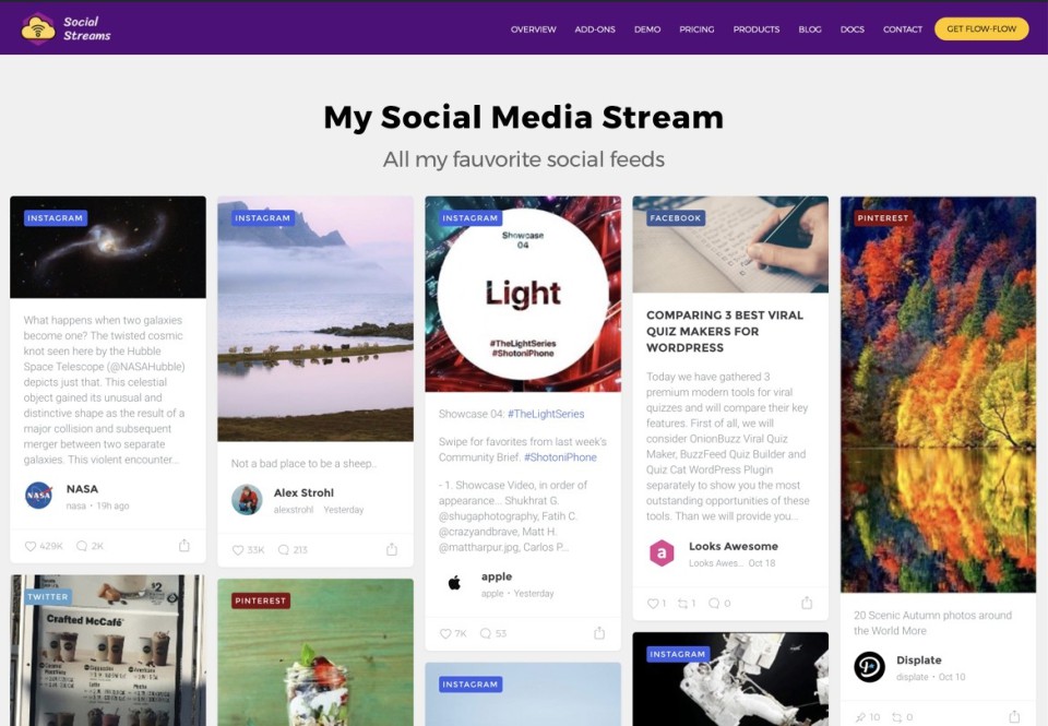 آیا دوست دارید محتوای جذاب شبکه های اجتماعی خود را به طور مستقیم در وب سایت وردپرسی خود نمایش دهید؟ در این صورت، Flow-Flow Social Feed Stream Pro نجات دهنده شماست! این افزونه قدرتمند به شما این امکان را می دهد که فیدهای خود را از فیس بوک، توییتر، اینستاگرام، پینترست و سایر پلتفرم های محبوب به زیبایی در وب سایت خود ادغام کنید.