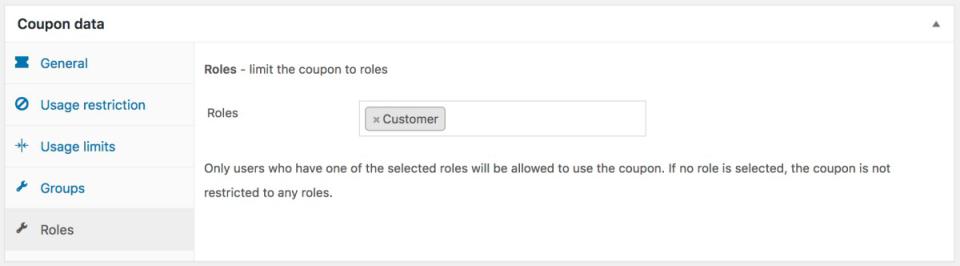 - محدود کردن کوپن ها به نقش های وردپرس: Group Coupons این امکان را به شما می دهد که استفاده از کوپن های تخفیف را به نقش های خاصی از کاربران وردپرس، مانند مدیر، ویرایشگر یا نویسنده، محدود کنید. این ویژگی برای مشاغلی که به سطوح مختلف دسترسی کاربر نیاز دارند مفید است.