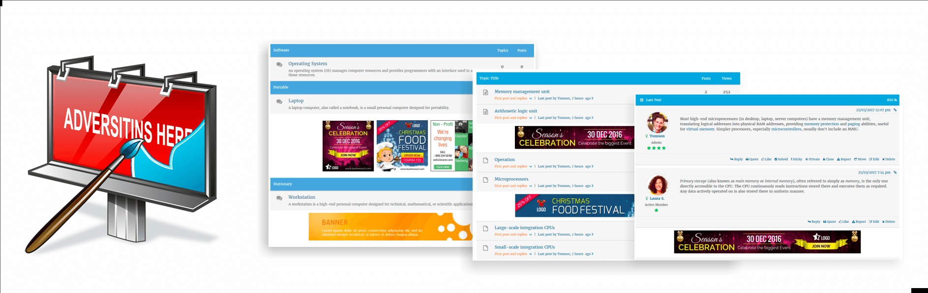 موقعیت های جذاب برای نمایش تبلیغات: این افزونه به شما امکان می دهد تا تبلیغات را در قسمت های مختلف انجمن خود نمایش دهید، از جمله بالای انجمن، سربرگ، پاورقی، پایین انجمن، لیست دسته بندی ها، لیست انجمن ها، لیست تاپیک ها و لیست پست ها.