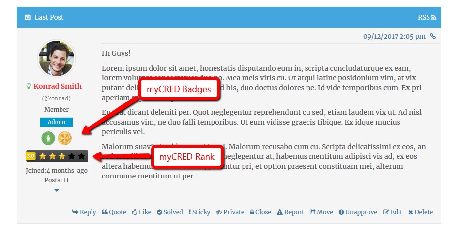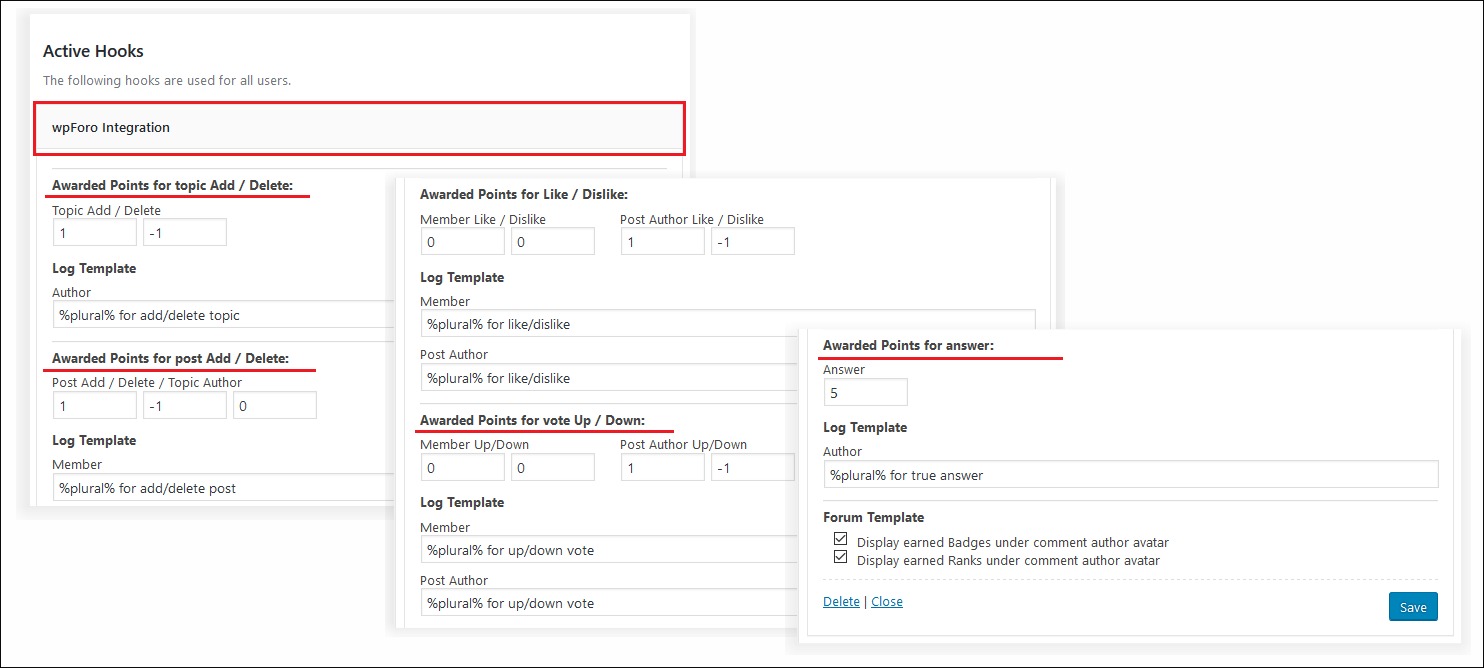 اعطای امتیاز برای فعالیتهای مختلف: با استفاده از این افزونه میتوانید برای فعالیتهای متنوعی نظیر ایجاد موضوع جدید، ارسال پاسخ، دریافت لایک و دیسلایک یا رأی مثبت و منفی به کاربران امتیاز اختصاص دهید.
