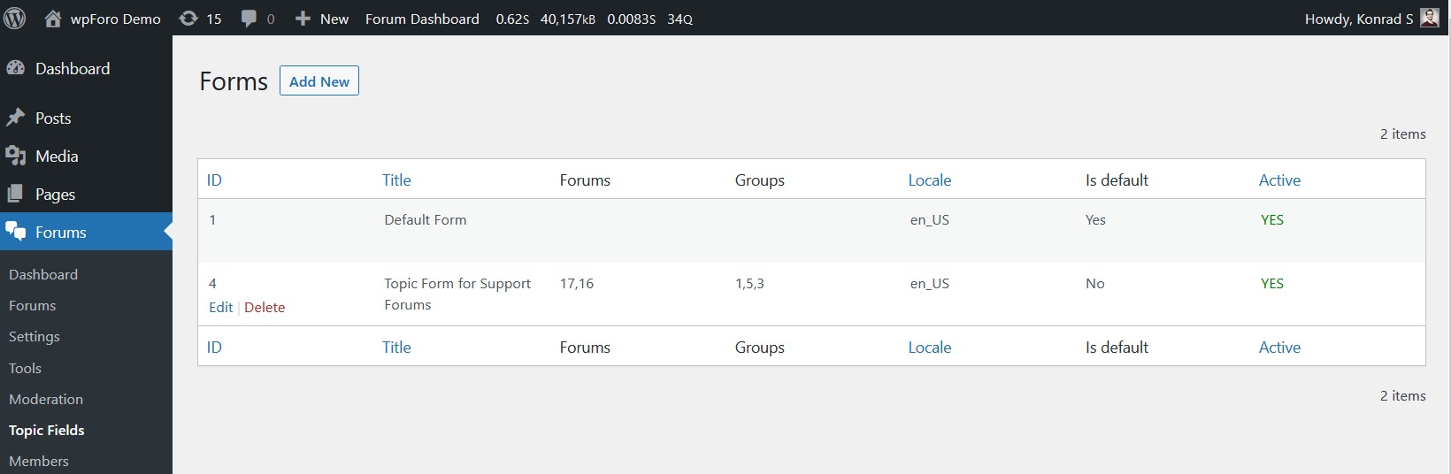 به بخش wpForo -> انجمنها -> مدیریت انجمن بروید. انجمنی را که میخواهید فیلد سفارشی را به آن اضافه کنید، انتخاب کنید. به تب تنظیمات فرم بروید. فیلدهای سفارشی مورد نظر خود را از لیست انتخاب کرده و آنها را به فرم موضوع خود بکشید و رها کنید.
