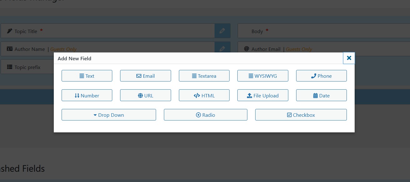 wpForo Topic Custom Fields از انواع مختلف فیلدهای سفارشی پشتیبانی میکند که میتوانید از آنها در فرمهای موضوع خود استفاده کنید: