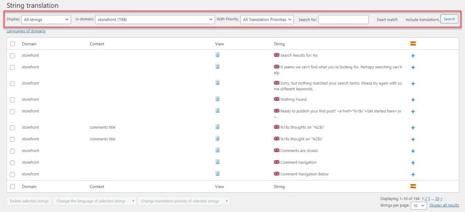 - ترجمه رشته ها: به منوی WPML -> String Translation بروید. در اینجا لیستی از تمام رشته هایی که نیاز به ترجمه دارند را مشاهده خواهید کرد. شما می توانید رشته ها را بر اساس قالب یا افزونه فیلتر کنید.